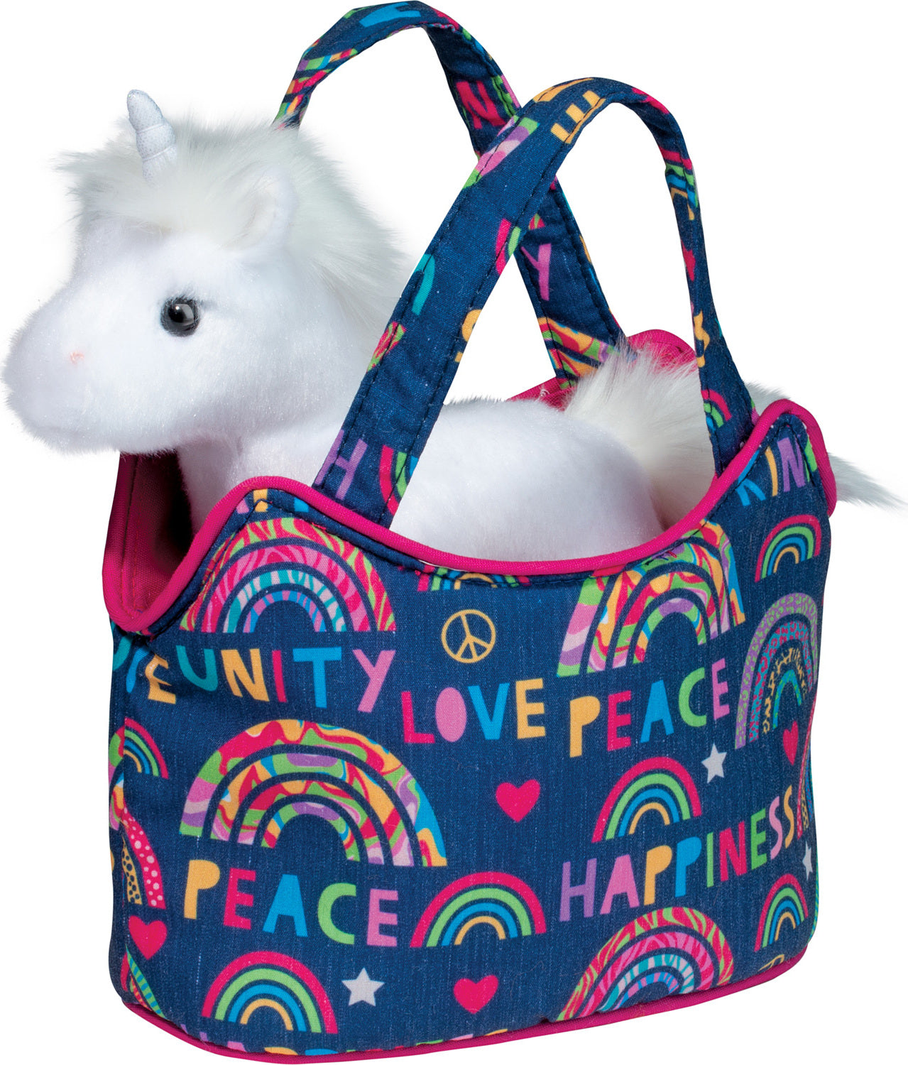 Stand for all that is good and spread positive vibes whenever you accessorize with Douglas' Kindness Sassy Pet Sak! Bearing the words Unity, Peace, Love and Happiness amidst colorful rainbows and symbols, this winsome fashion accessory is a joyful reminder to be the good that we wish to see in the world. Magenta pink piping complements the rich, navy blue hue of the pattern's background. A magical companion in the form of a sprightly plush Unicorn is ready to leap from the bag and into your imaginative adventures. Soft, white materials and a bright eyed expression make her an engaging, stuffed animal friend. Show the world that kindness is always in style with this colorful plush purse!
