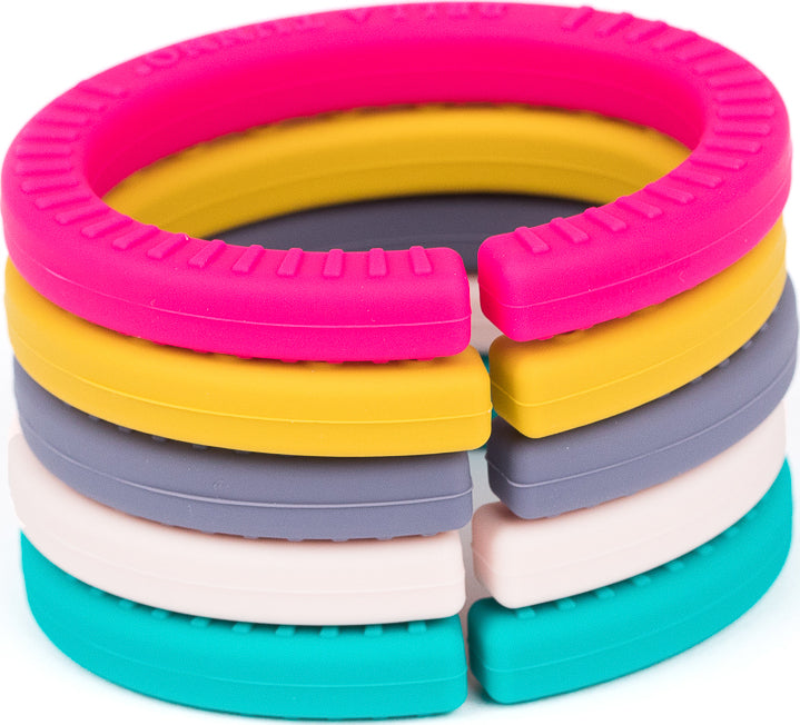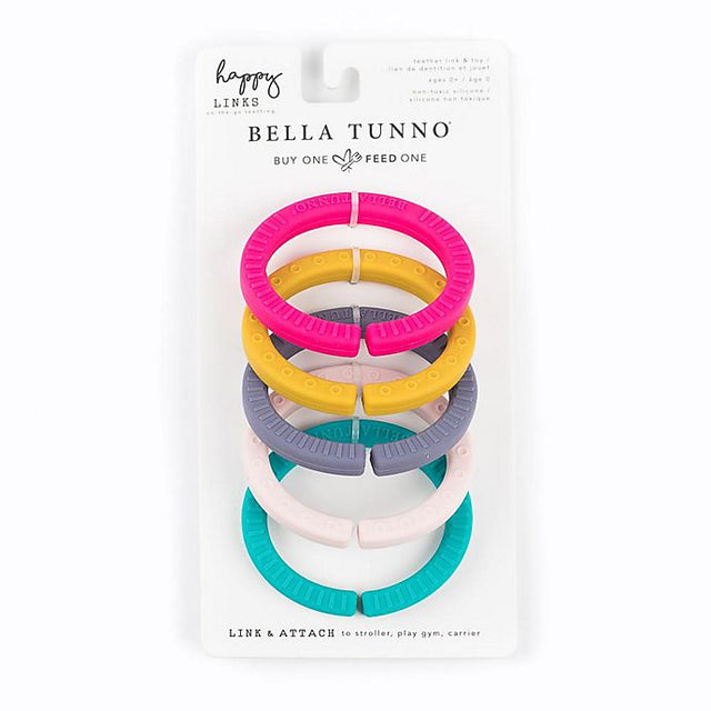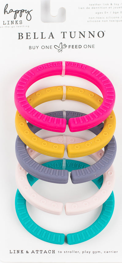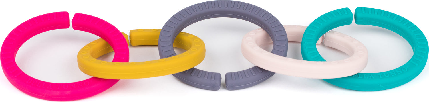 Bella Tunno took the classic link and made it into the product we wish we had for our littles. Generously sized, easy to grip and wrapped in food-grade silicone, these links relieve little gums, keep toys and lovies attached and keeps kids entertained. The Happy Links set includes 5 links for teething playing and organizing. Attach them to the stroller, rocker, play gym, or carrier to bring the fun wherever you go.