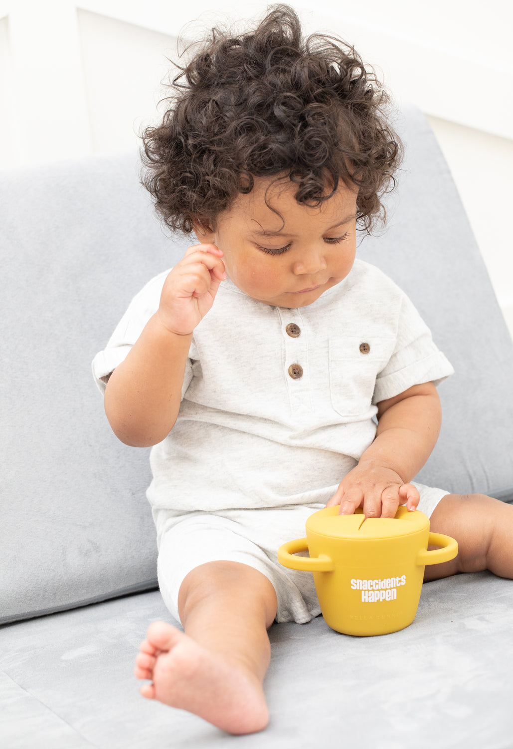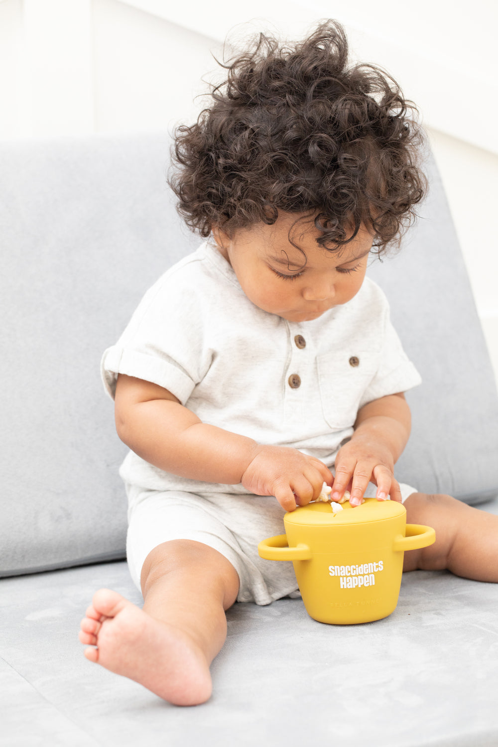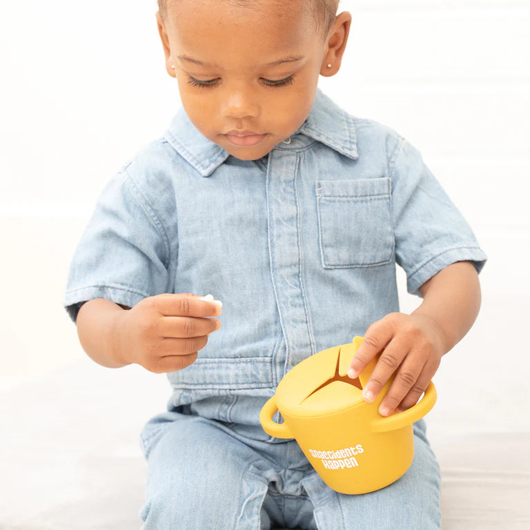 New and total Exclusive, the Happy Snacker is the first two piece silicone snack cup! No more trails of crumbs to pick up thanks to the snap tight lid - go ahead and put the vacuum away.