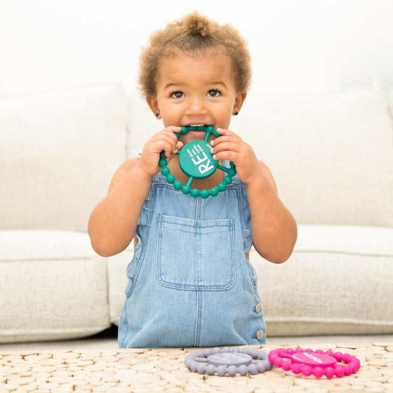 Teething rings designed with purpose! Designed with one thing in mind: teething relief for baby that translates into peace and quiet for parents.
