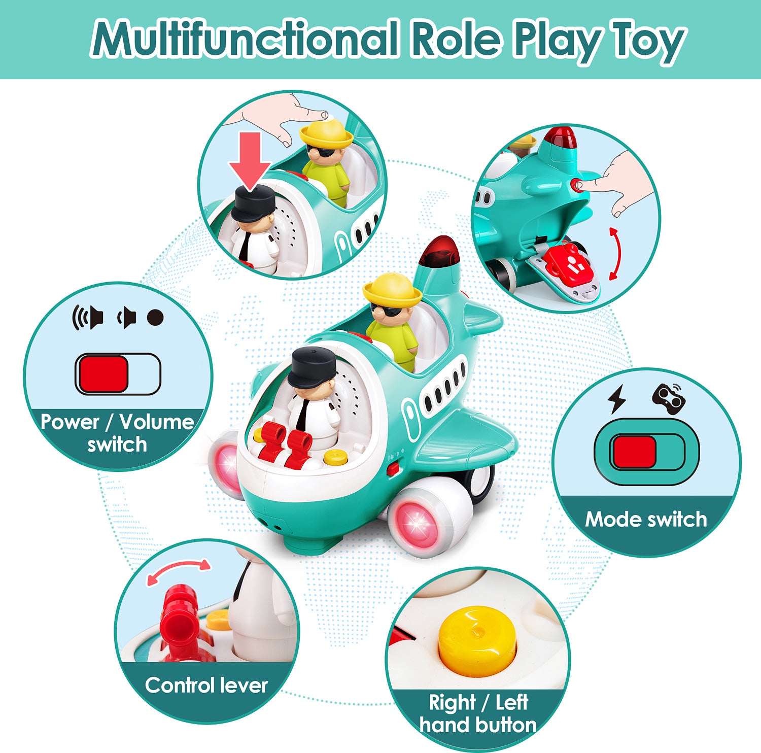 Toddlers giggle with delight as they crawl after this baby-safe airplane with lights and sounds! It has a simple remote that can be toggled to automatic mode (self-driving, avoids bumping into objects) or RC mode (controlled with forwards and backwards buttons). We love that it has two sound levels and storytelling elements that encourage pretend play: removable captain and passenger, and cargohold with suitcase. Requires 4 AA batteries for the airplane and 2 AAA batteries for the remote, not included.