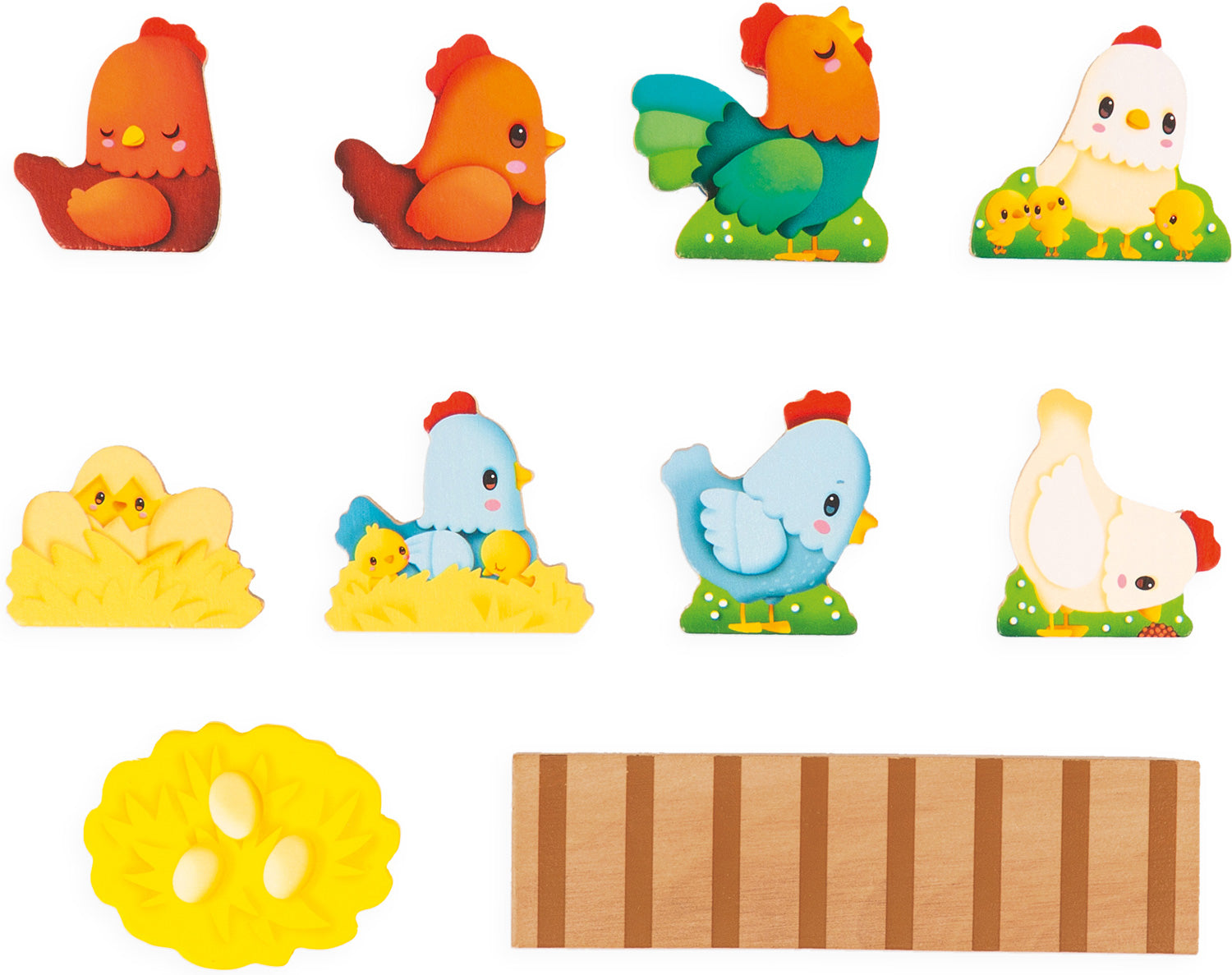 Cock-a-doodle-doo! Time to wake up and discover new storytelling adventures on the farm! We love this beautifully designed wooden chicken coop playset as screen-free imaginative play tool. Toddlers will giggle with delight as they discover that the animals can enter the coop through various openings, just like a shape-sorting box: through the sliding door located at the back of the henhouse, through a side door with an elastic hinge, through a hen-shaped hole, or even using the removable ladder! Ask children to find the chicks, count the eggs, and describe what each chicken does! The coop comes with 6 hens, 1 rooster, 1 nest with hatching eggs, 1 nest with a chick, and ladder.