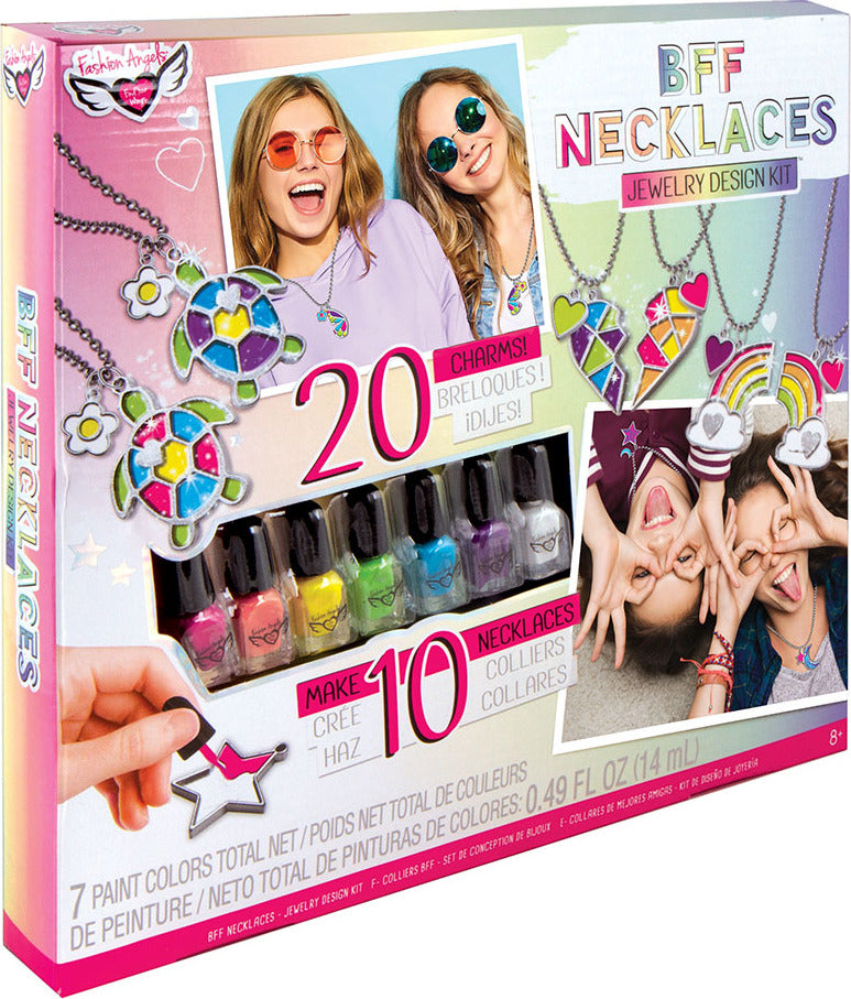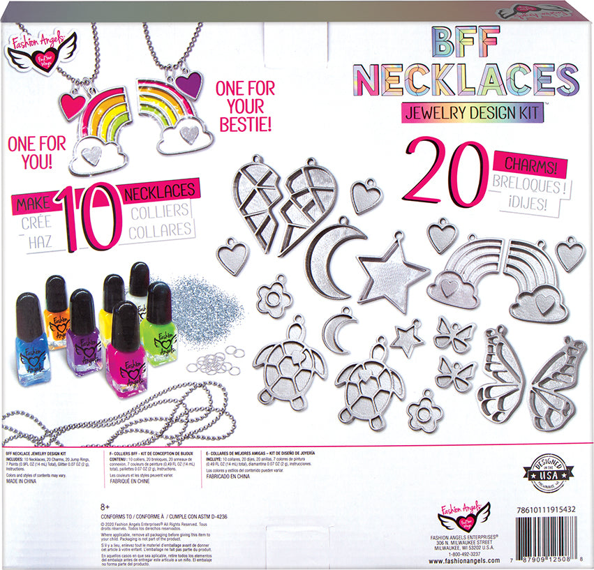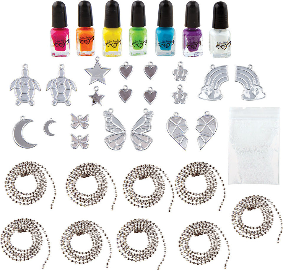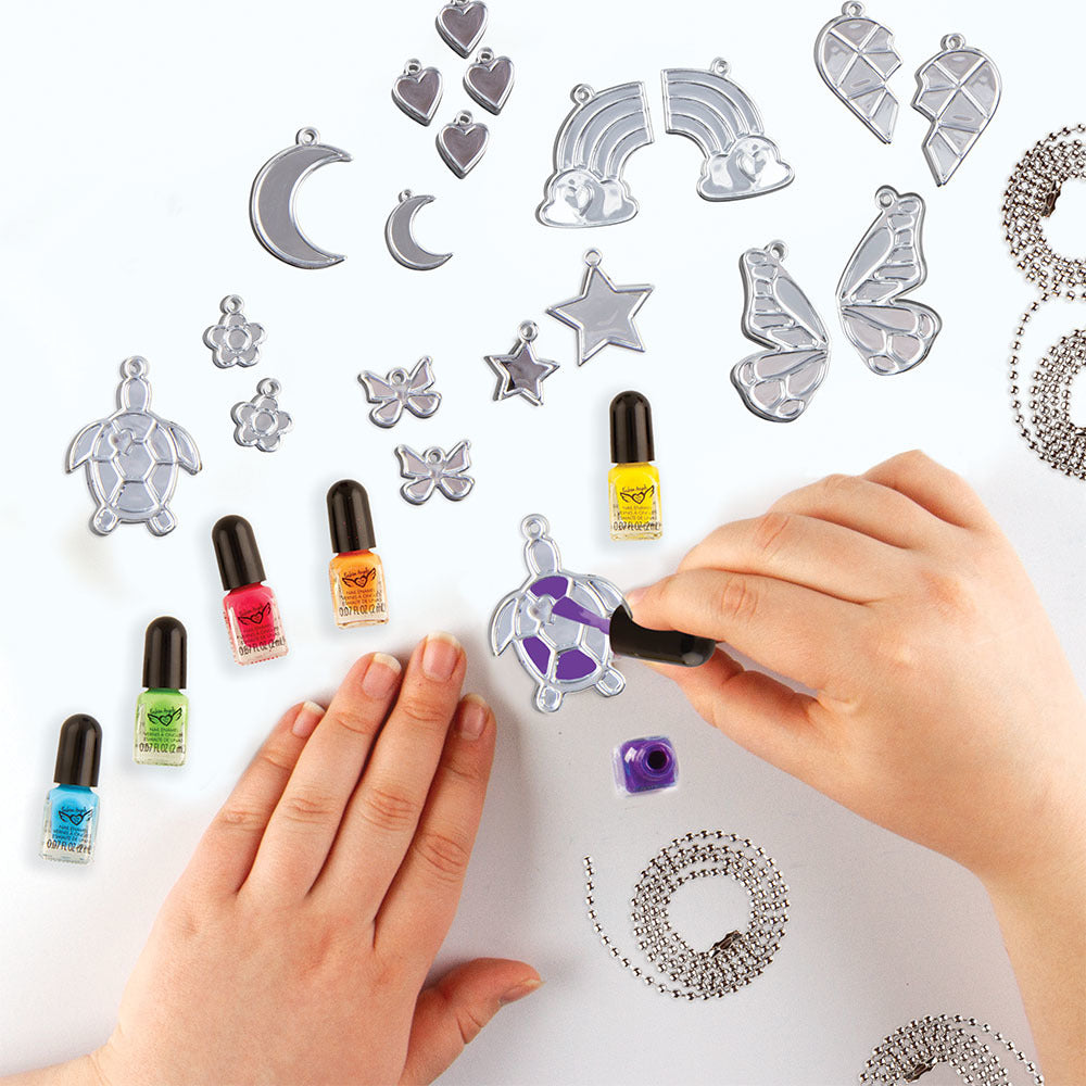 Creative tweens will love to make and gift the 10 necklaces included in this kit to all of their best friends. Using the 7 rainbow colors of nail polish, tweens will paint the silver metallic charms and place them onto the ball chain necklaces. Nail polish is quality tested and non-toxic and best of all they can use the nail polish for manicures as well. Easy to do and we have included an inspirational instruction sheet. This is also a great activity for birthday parties, sleep overs or club activity events as there are enough contents for 10 participants. This is also a great activity to keep tweens off screens and doing something creative.