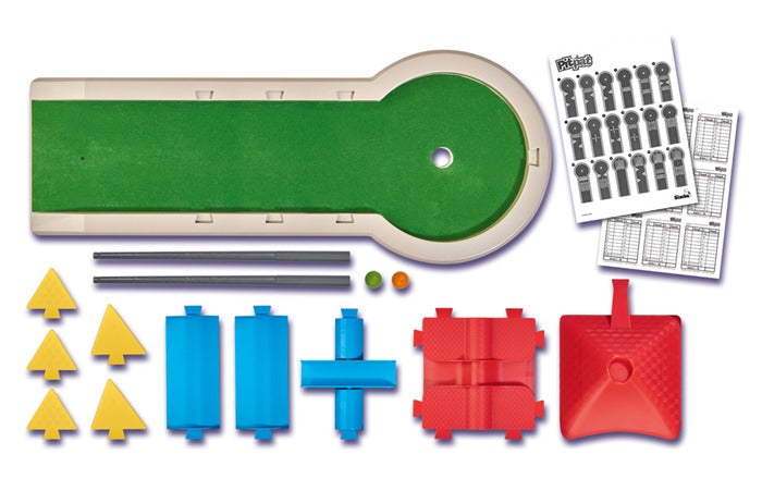 Pit Pat Mini Golf is a table top game that combines mini golf and billiards. Players can set up their own mini golf holes using 10 different obstacles. There are over 100 course options! The object is to strike the ball with the cue and make it into the hole in as few shots as possible. The mini golf obstacles include tunnel, ramps, bridge, volcano and more! A fun game for the whole family, there is something for every age and difficulty level. The game comes with a mini table top golf course, 2 balls, 2 cues, 10 obstacles, scoring sheets and an 18 hole course pamphlet. Ages 5+.