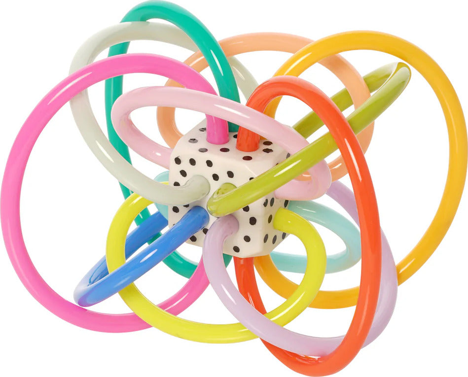Colorful loops made from soft, pliable plastic are easy to grasp and hold, plus caregivers can refrigerate it transforming it into a cooling teether. The center cube contains a soft-sounding rattle that encourages cause and effect learning while providing auditory stimulation.