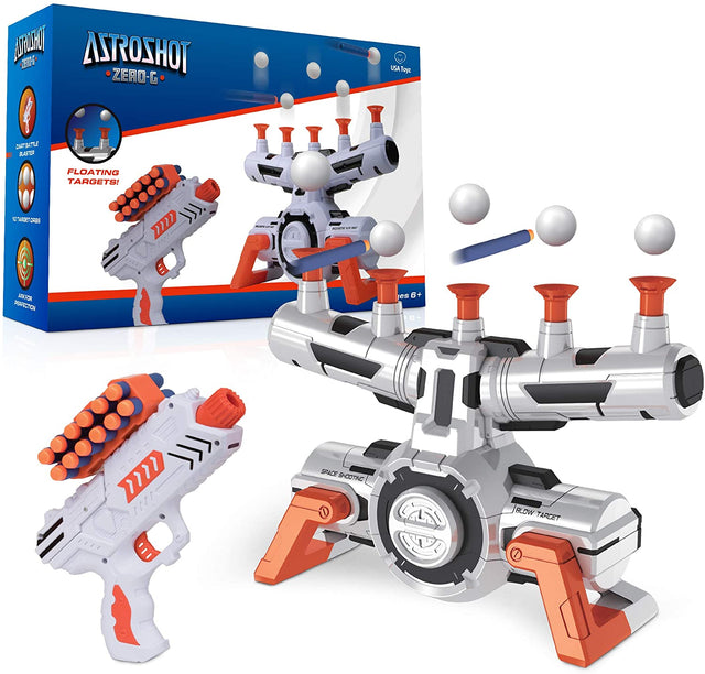• COMPLETE SHOOTING TARGETS GAME KIT: The Astroshot Zero G multi player target shooting game set includes 1 target shooting gallery, 1 foam dart gun, 12 soft foam darts, 1 dart clip, and 10 hovering ball targets.