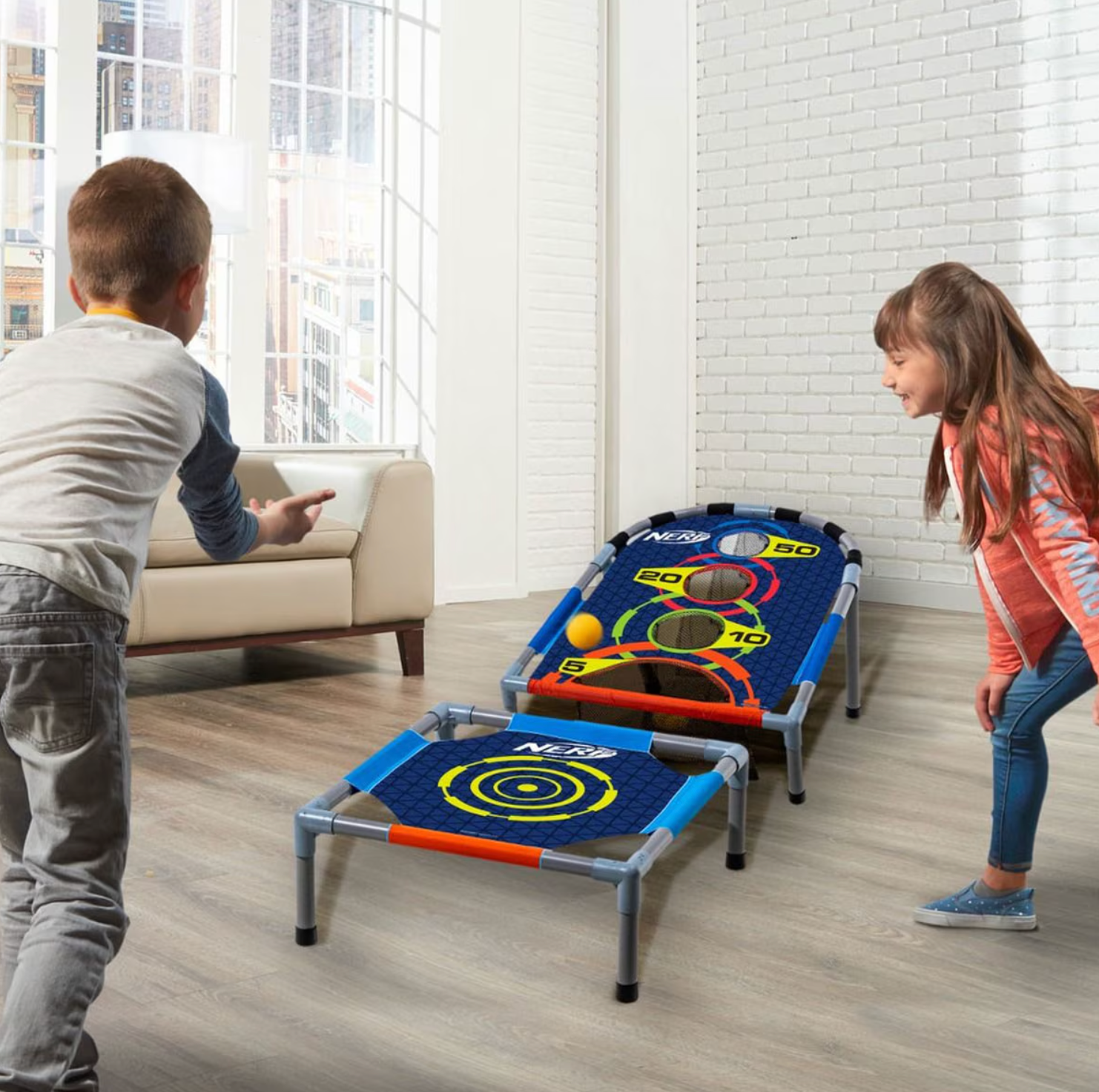 Bring the arcade home with Nerf! Bounce 'n Score is designed with flexibility in mind - the launch pad is separate from the target platform so that kids can adjust the bounce distance to make the game easier or more challenging as needed. The foam balls are soft and squishy, making this a perfect indoor active game. Set includes launch pad, target platform with mesh pocket for storage, and 6 soft Nerf balls.