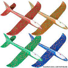 This assorted style plane glider can not only do tricks, but it also has an LED light on the front for play after dark. Included are some flying tips on the back of the packaging. Assemble dimensions: 19” wing span, 10” length, and flying weight is 1.45oz. Sold individually, styles vary. We’ll assort on orders of more than one.