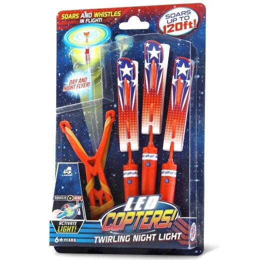 • Sling shot these light up copters into the air to create a whistling sound sound and dazzling glow