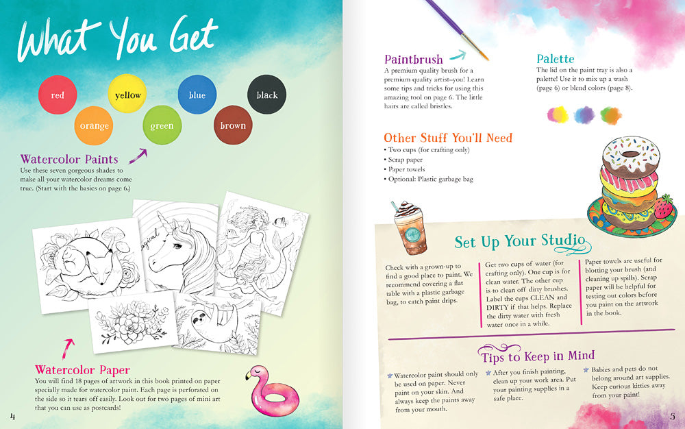 It's a dream come true for aspiring young painters of all levels - watercolor basics through more advanced skills are all here. The instruction book is a work of art itself, full of wonderful techniques that inspire everyone. Learn color blending and different types of brushwork to create amazing special effects for your masterpiece. 7-color paint palette and brush included, plus 20 delightful designs to get you started, from cute animals to magical mermaids.