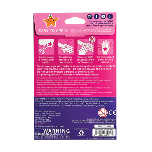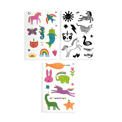 Happy was just made wearable with these unicorn party tattoo sheets. Durable and long lasting, these charming temporary tattoos are perfect for birthday parties, sleep overs, or any gathering of creative kids! What does it take to throw a unicorn party? Just put on some of these temporary tattoos, bring your imagination, and you’ve got a shindig that’s magically amazing! This mini pack includes three tattoo sheets of temporary tattoos that are constructed to be durable and long-lasting. Two sheets are in full color and one is in black and white. Designs include unicorns, butterflies, hearts, rainbows, and more. These are perfect as party favors, as a party activity, or even just as a fun thing to do on a relaxing afternoon with your little one!