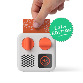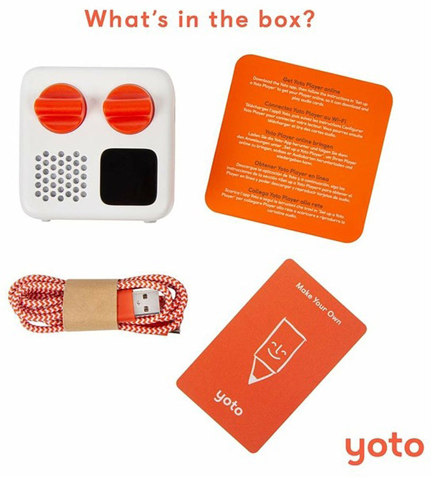 Kid-friendly and portable, this mini audio player streams content from its app, by radio, and from physical cards for listening to stories, songs, books, and even sleep sounds. Choose from a wide selection of over 400 titles of pre-recorded cards, or blank cards that can be personalized with your choice of audio. Download the Yoto App for iOS or Android to guide you through the very quick setup process, and get instant access to your cards, record stories in your own voice, change the nightlight color - plus a whole lot more. The battery will last up to 20 hours on a full charge, so it's perfect for road trips or play dates. It also has Bluetooth support and works with Bluetooth headphones, for when you need it a little quiet. Includes a USB-C cable and a quick start guide. Yoto cards and other accessories sold separately.