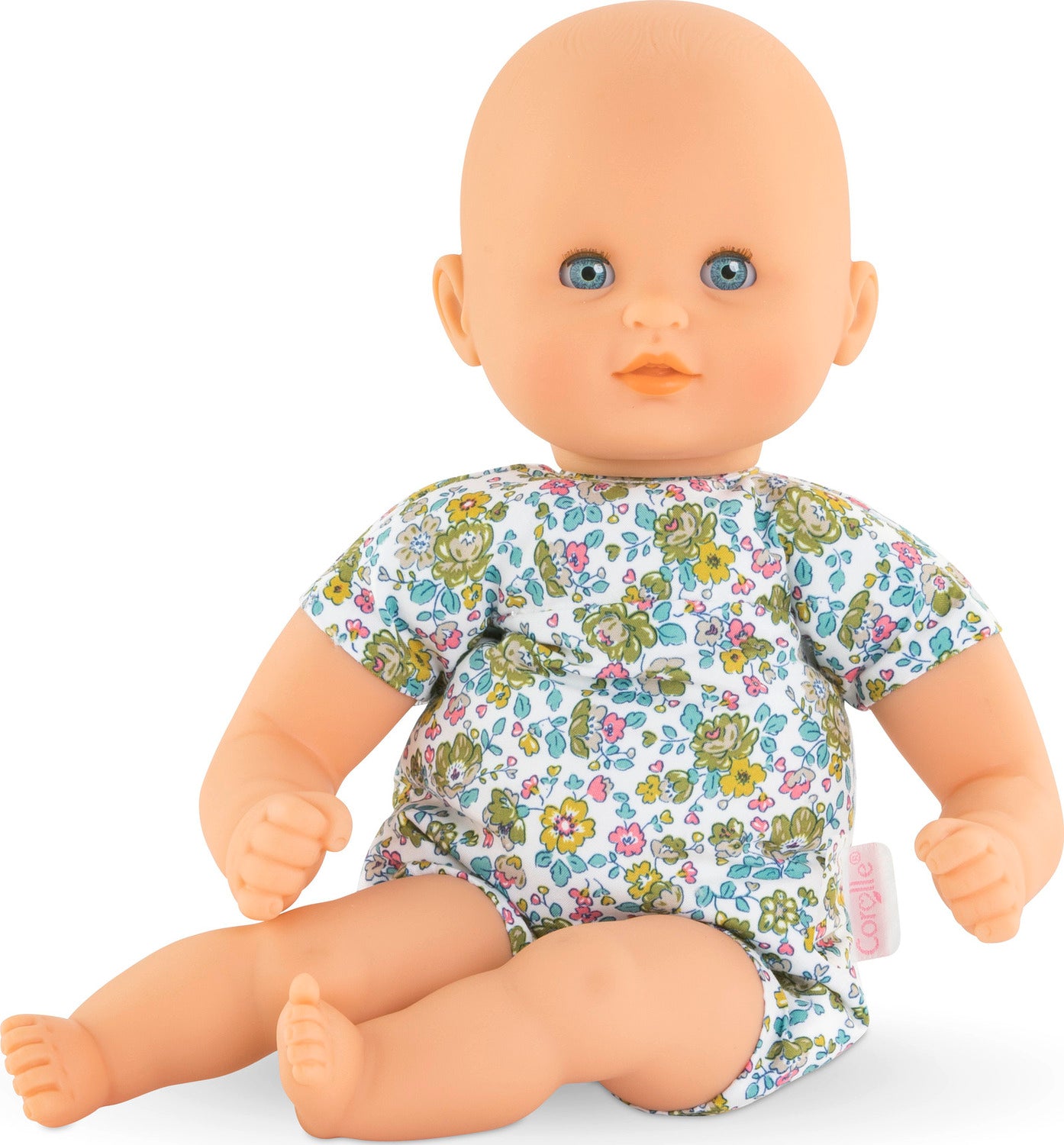 Bébé Calin Loving Teddy Bear is a 12-inch baby doll that is perfectly sized to be cradled in a young child's arms and is ideal for hugging and cuddling. The doll's face, arms and legs are made of touchably soft vinyl that is delicately scented with vanilla -- a Corolle signature. Bébé Calin Loving Teddy Bear's soft body is poseable, like a real baby. The doll's blue sleepy eyes close when it's put down for a nap or at bedtime, also like a real baby. Bébé Calin Loving Teddy Bear's furry "suit" is removable to reveal a printed body. The doll comes complete with a feeding bottle and lovey. Ages 18 months and up.