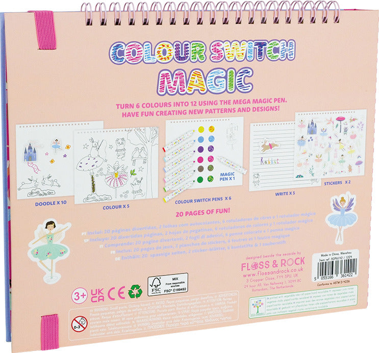 Double the fun with Color Switch Magic! The magic white pen turns 6 colors into 12, resulting in hours of fun creating patterns and more. Each pad contains 10 doodle pages, 5 color-in pages, 6 color switch pens, 1 magic pen, 5 lined pages for writing and 2 sticker pages.