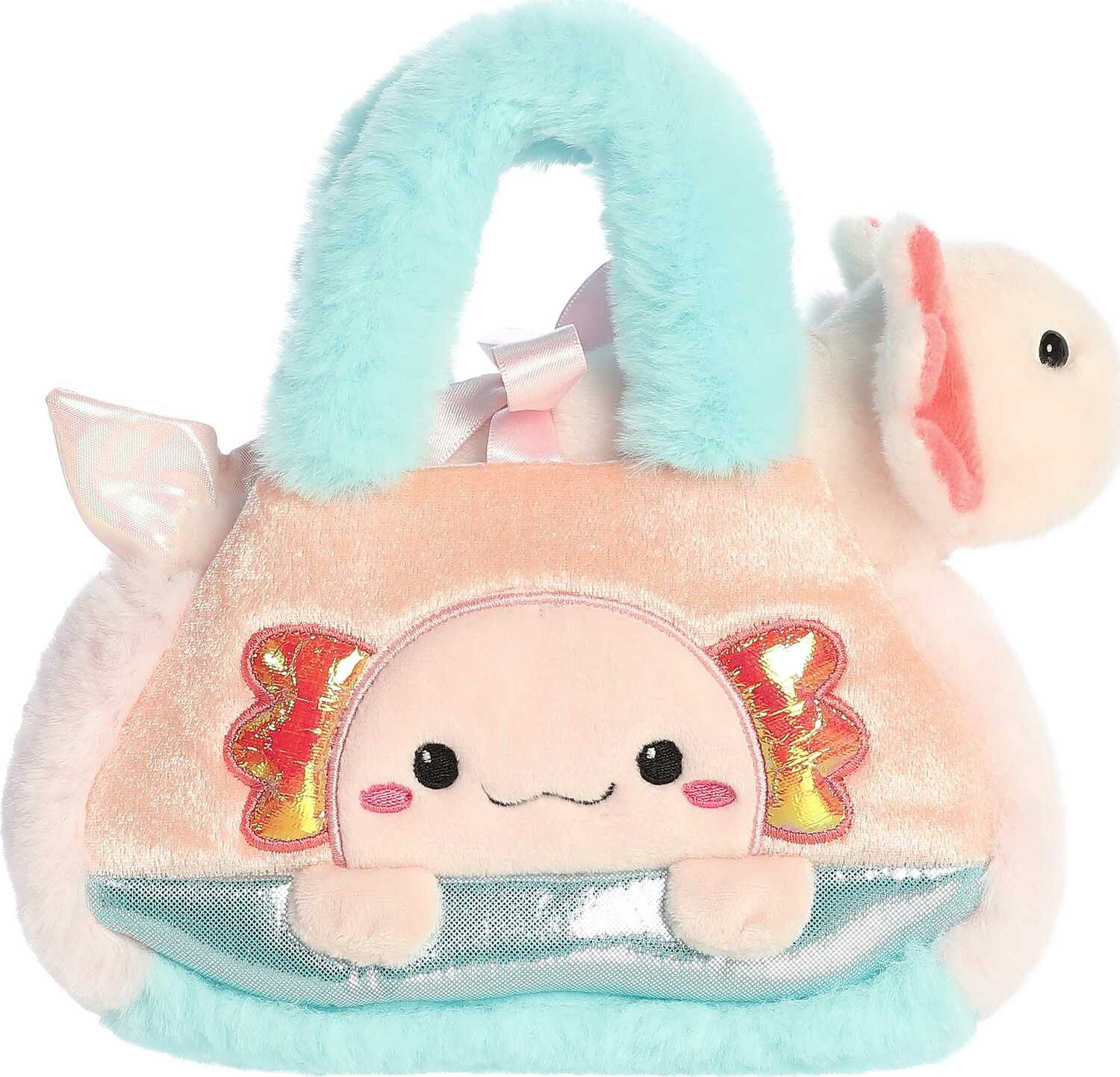 Magical Peek-A-Boo Axolotl Plush & Carrier Set - Enchanting Aquatic PalStep into the magical world beneath the waves with Aurora World's Peek-A-Boo Axolotl Plush & Carrier Set from the Fancy Pals collection. This enchanting set features a charming pink axolotl plush that fits snugly inside its own pastel-hued carrier, adorned with shimmering accents and a sweet bow. The carrier's plush material and the axolotl's vibrant pink color are sure to captivate and delight.