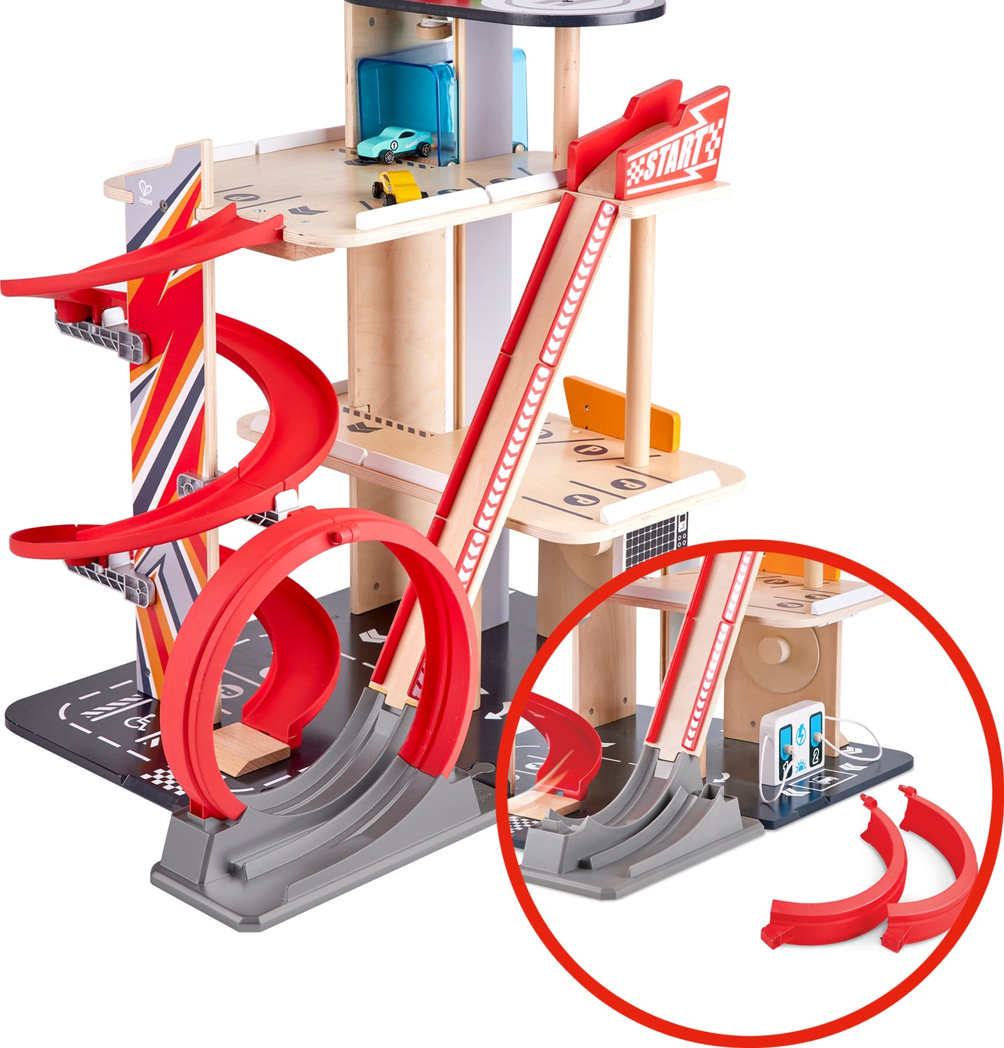 Two stunt tracks for racing and an elevator that lifts the cars to the upper levels make this the coolest 3-level parking garage ever! Two fast, free-wheeling cars are included, for sending down the spiral ramp or defying gravity with the 360° loop track. Safe, sturdy wood construction guarantees many years of imaginative entertainment.