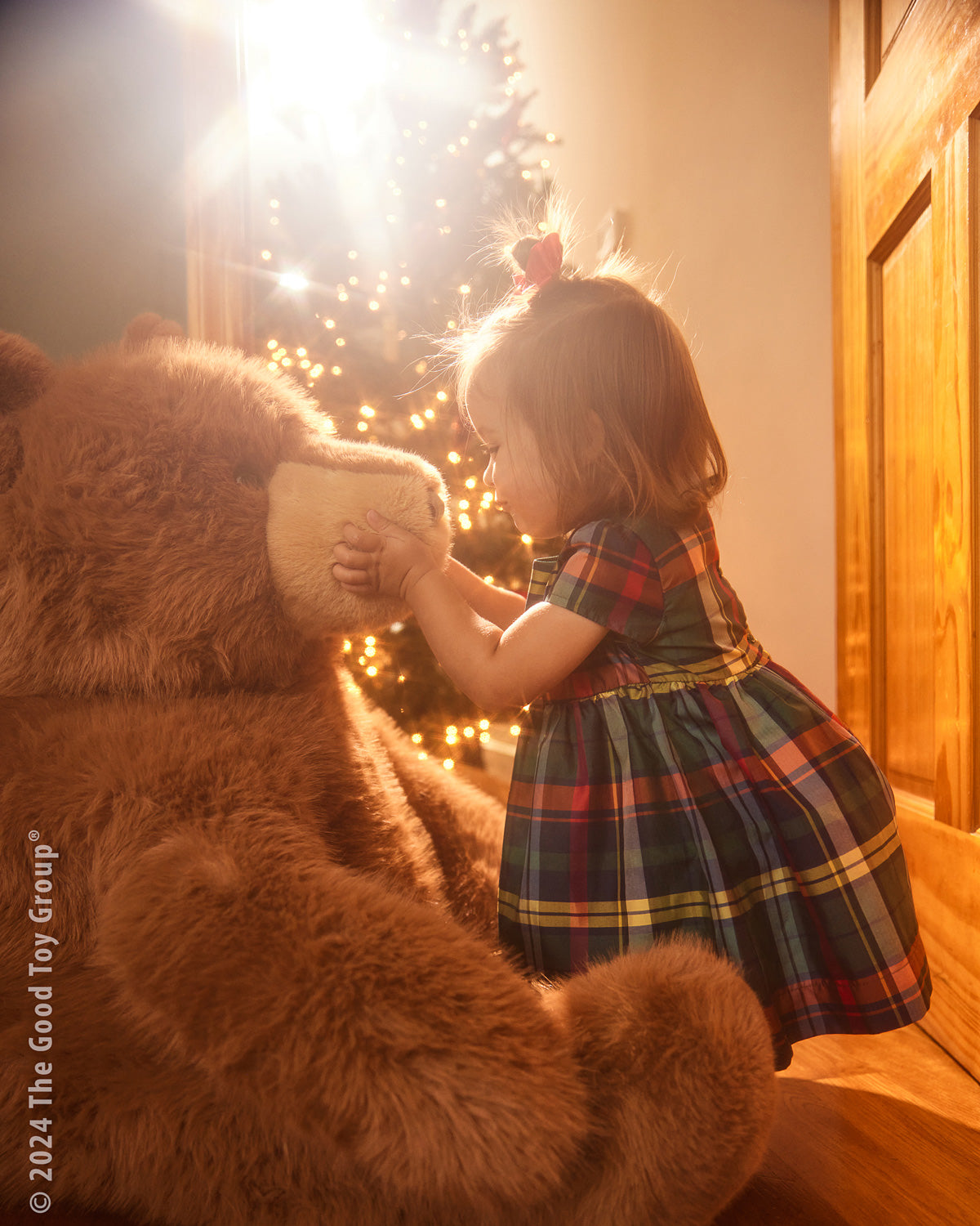 Calling all grandparents: here's a gift that wows! This super cuddly jumbo plush bear is ready for years of memory-making adventures! Sitting at nearly 3' tall, Jefferson is bright-eyed and sitting sweetly, ready for kiddos to be drawn to his size and huggable softness. He'll look great sitting under a tree on Christmas morning, and will leave kids awestruck as they pull him out of a giant gift box!
