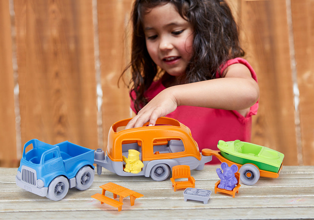 Time to hit the road! The Green Toys™ RV Camper Set is loaded up and ready for an adventure! This colorful, 3-in-1 vehicle playset has something for everyone, featuring a pick-up truck, spacious camper, and sport boat with its very own trailer. Play with them individually, or link them all together for two feet of fun! And don’t forget the accessories – two characters, two chairs, a picnic table, and a camping stove round out this 10 piece set with endless narrative play possibilities. Great for indoor and outdoor play, the super-safe design has no metal axels or exterior paints or coatings.