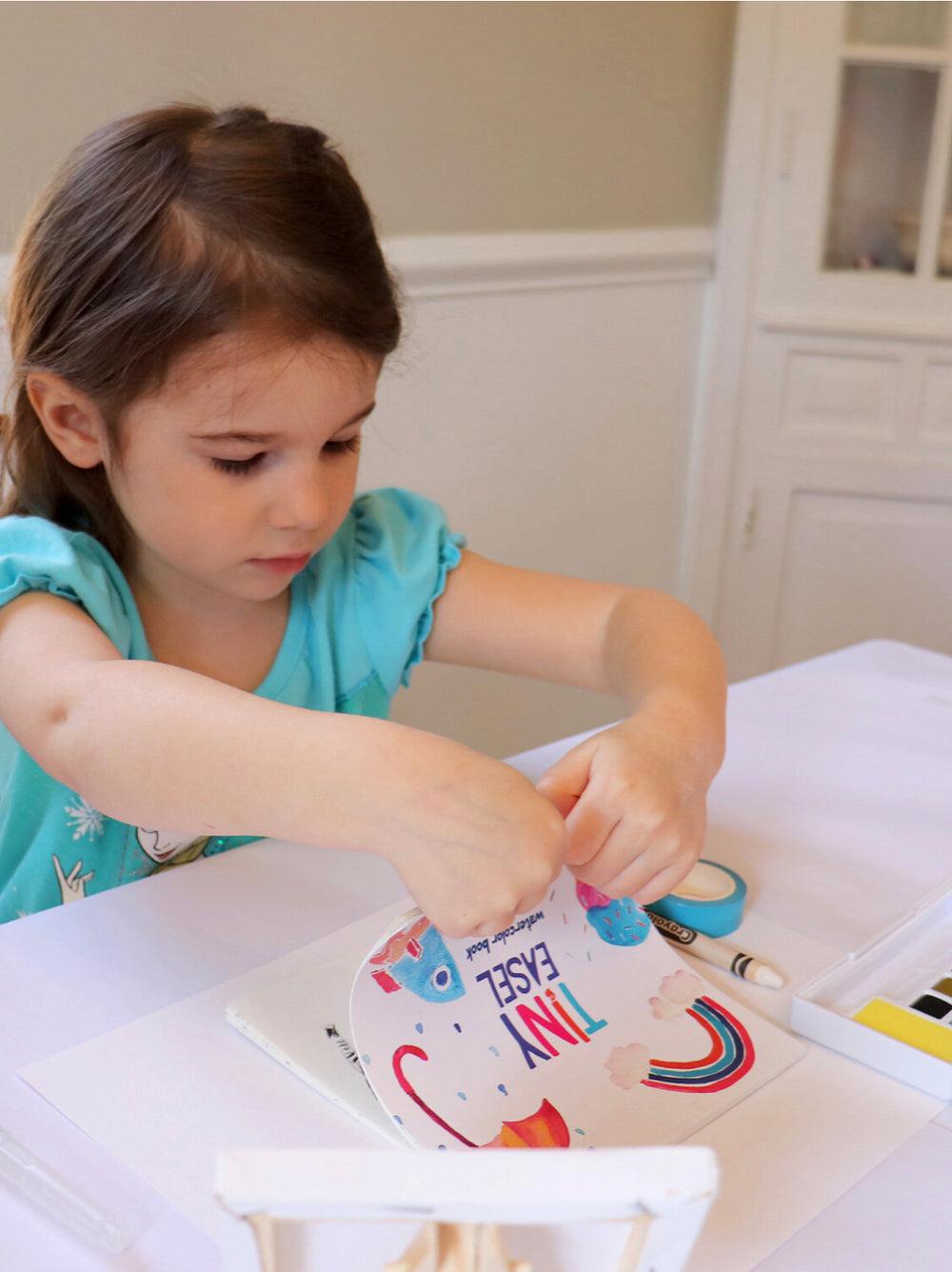 The Tiny Easel Traveler kit is perfect for traveling and adventures on-the-go. Just bring your Watercolor Book and Watercolor Crayons to the restaurant and come back home to add water to bring it to life. Take the whole kit on vacation and let your kids paint on the beach. Fill the water brush wand with water and your tiny artist is ready to create outside or on-the-go!