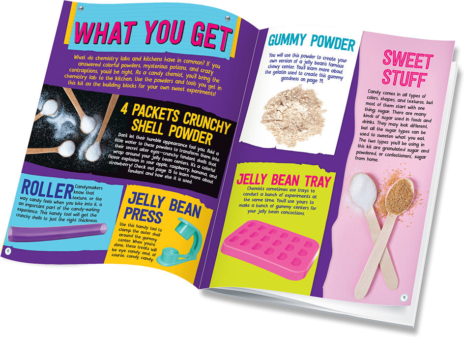 Turn your kitchen into a candy laboratory! Use the powders and molds in the kit to make 36 colorful jelly beans in 4 sweet flavors. Then, follow instructions using ingredients from home to make marshmallows, lollipops, fudge, and more! Learn the science behind the sweet, stretchy, sticky stuff that makes up the candies you love while experimenting and putting your own twists on classic treats!