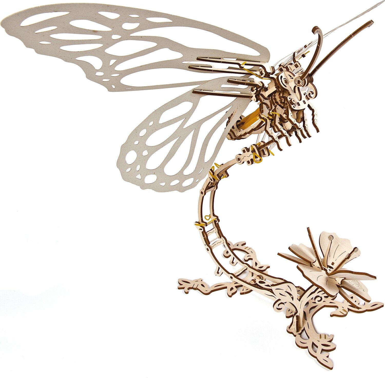 Fascinated by the unique synergy of nature and mechanics, Ugears continues to explore the amazing world of automatons and presents its latest mechanical pet, the Butterfly model. The Butterfly is not a static stand model, but an animated kinetic sculpture. Each of its details designed to make sure it fits its own place and plays its own part in the workings of this outstanding mechanism. Equipped with a rubber-band motor, the mechanical automaton moves imitating the flutter of a butterfly with no external power source or batteries. As with every model in the Ugears family, The Butterfly requires no glue or additional tools to assemble. You will build your new model out of ready-made details that come precisely pre-cut in high quality natural plywood boards. Slightly pushed, the details easily pop out of the board. The assembly is constructed by blocks: initially, the details must be put together to form smaller blocks that in their turn will compose the whole model. The process of assembly is described in a comprehensive step-by-step instruction manual with detailed color illustrations, in 11 languages (English, German, French, Polish, Spanish, Ukrainian, Russian, Japanese, Italian, Chinese, and Korean). The size of the assembled model is 290 Ñ... 550 Ñ... 400 mm. The set includes 161 details. The delicate wings of The Butterfly are made of craft paper. The lower wings change their tilt angle when the model is working to ensure that the movements of the automaton resemble those of a real butterfly. Two front pairs of its legs move while the wings flutter. The back pair of legs are used as launch/stop levers of the rubber-band motor. Your Butterfly comes with two sets of wings: a color one and a less bright, beige one, that you can paint as you like. The Butterfly sits on a flower-shaped platform. The elastic support slightly bounces the model, making its movements more realistic so that The Butterfly dances and flutters in the air approaching the flower. Ugears strives to share its knowledge and passion for smart mechanisms with children and adults, kids and parents. We want the complex and beautiful world of mechanics to become closer and more comprehensive. This is why the body of The Butterfly is designed in a skeleton-style, which allows you to see the working of gears and blocks inside and understand how the mechanism works. This interesting and attractive model is fun to assemble, study, and play with. It can be a wonderful present to a friend, colleague or family member. The delicate iconic design from Ugears guarantees that your new model will look gorgeous in any home or office. Model Size: 14.2 x 22.8 x 22.8 in Package size: 14.6 x 6.7 x 1.1 in Number of parts: 168 Level: Intermediate Assembly Time: 3 hours Recommended Age: 14+ Kit weight: 1.28 lbs Case Pack Quantity: 6 Manufacturer: UGears