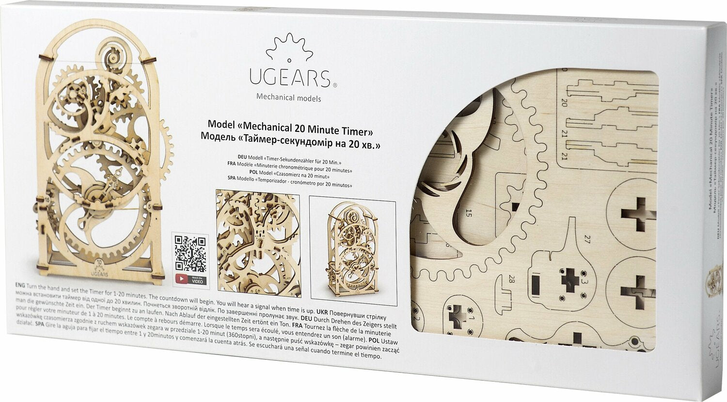 If you like building things, the UGears 3D mechanical Model Timer wooden puzzle for adults, teens, and kids is a perfect fit for you. This exquisite and refined model gives the feel of a real-life mechanism. The Model helps people to understand the details involved in mechanical motion, through the self-assembly of motion models. The estimated time of assembly is 3-4 hours which will help kids and adult to develop logical reasoning during the assembling. Ugears 3D mechanical Model enhances attention and concentration skills as well as improving attention to detail skills. The UGears Timer has a unique roller pendulum and a lever for amplitude adjustment on its backside. It is powered by the pull of a simple office rubber band, and this can be used to set the alarm on this unique piece.' It runs like a clock work ticking away in a relaxing rhythm. This beautiful meditative timepiece adds sophistication to any room! The alarm gives a pleasant pop sound after 20 minutes when it is set. It is made from high-quality eco-friendly wood materials that will last for years, and the constructions can be recycled with no harm to the environment. This model went through a lot of improvements and refinements to become this beautiful piece of machinery that anyone can put together for their delight. Size: 6.9 x 3.3 x 10 in Package size: 14.8 x 7.5 x 1.2 in Number of parts:' 107 Level: Hard Assembly Time: 3-4 hours Recommended Age: 14+ Kit Weight: 1.50 lbs Manufacturer: UGears