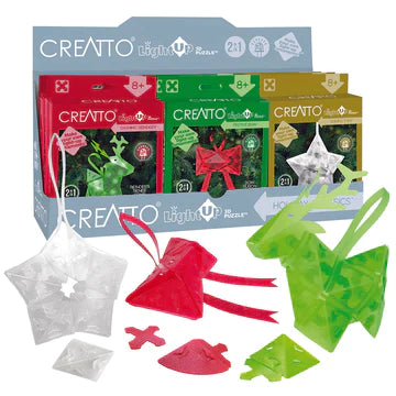 With 40 Creatto pieces and a string of 5 LED lights, you can build a green reindeer or a fir tree. The models have loops for use as ornaments. Battery-powered lights require 2 CR2032 batteries. Suitable for ages 8 and up.