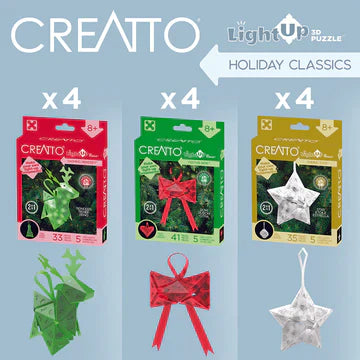 With 43 Creatto pieces and a string of 5 LED lights, you can build a red bow or a heart. The models have loops for use as ornaments. Battery-powered lights require 2 CR2032 batteries. Suitable for ages 8 and up.