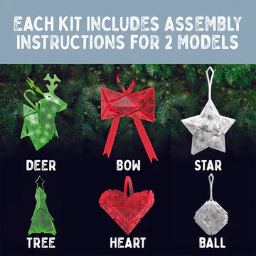 With 37 Creatto pieces and a string of 5 LED lights, you can build a white star or a ball ornament. The models have loops for use as ornaments. Battery-powered lights require 2 CR2032 batteries. Suitable for ages 8 and up.