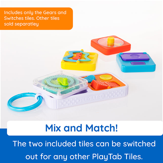 Take the joy of PlayTab with you wherever you go! The two included sensory tiles can be popped in and out of the flexible, durable case, and you can switch them out for any other PlayTab tiles. Plus, it has a clip for hanging from a car seat or stroller! Mix, match, and play on the go with PlayTab Go.