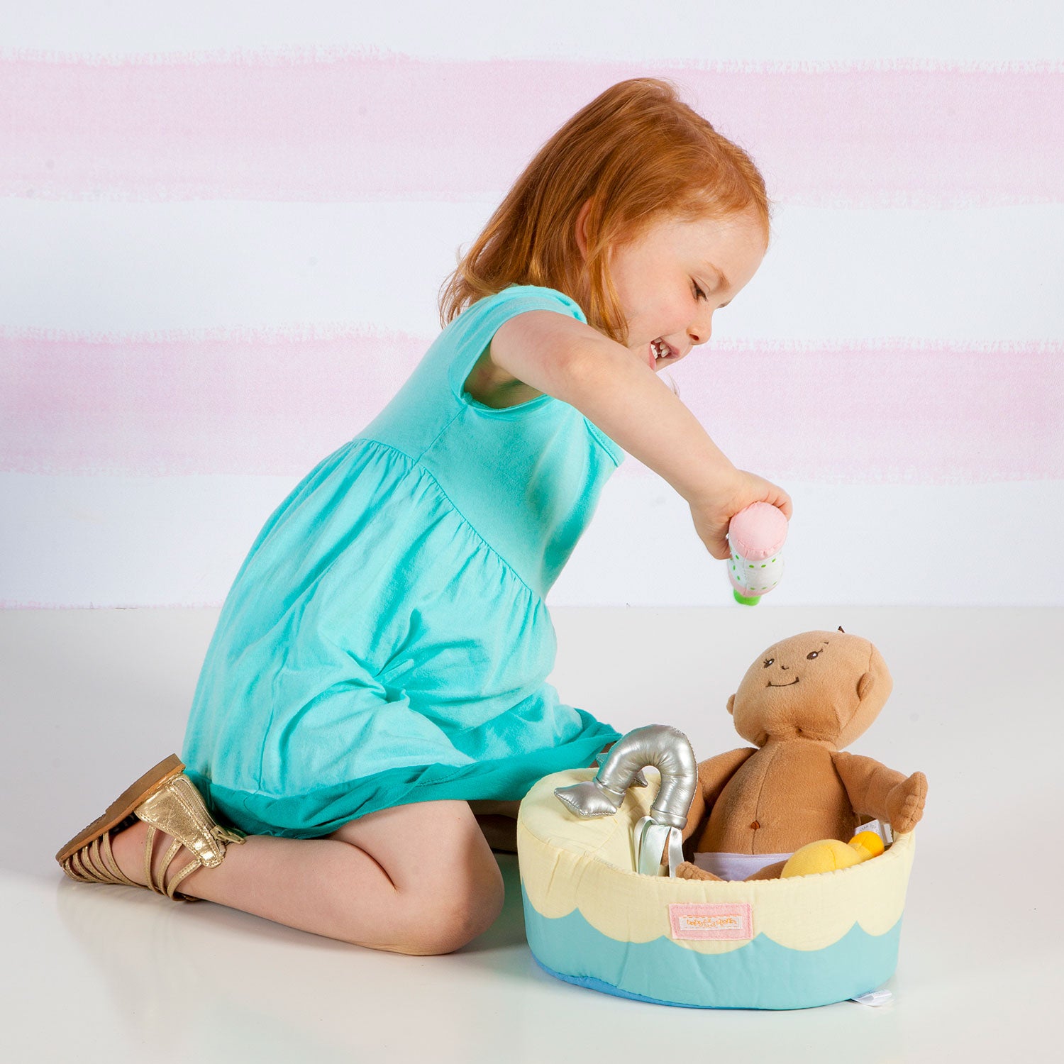 Baby Stella needs a bath! A soft tub with faux running water made of ribbon. Comes with a bathrobe, soft ducky, and soft shampoo bottle. The perfect Baby Stella accessory for your child's soft doll collection. Ages 12 months+ Measures 11L x 7H x 7W in Measures 27.94L x 17.78H x 17.78W cm Doll sold separately Surface wash only This product meets or exceeds EN71 and CPSIA safety regulations Comes boxed