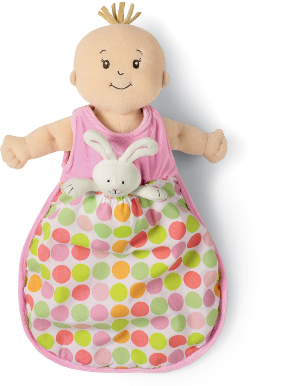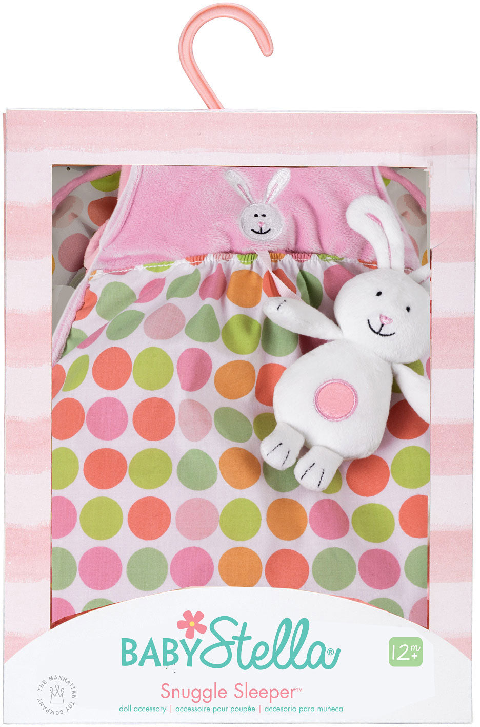 Baby Stella is certain to stay cozy and warm in the Snuggle Sleeper. This sweet snuggler features a pocket and includes a soft tethered bunny pal. Ages 12 months+ Measures 8.5L x 11.25H x 1W in Measures 21.59L x 28.575H x 2.54W cm Fits any 15 inch Baby Stella Doll Doll sold separately Surface wash only This product meets or exceeds EN71 and CPSIA safety regulations Comes boxed