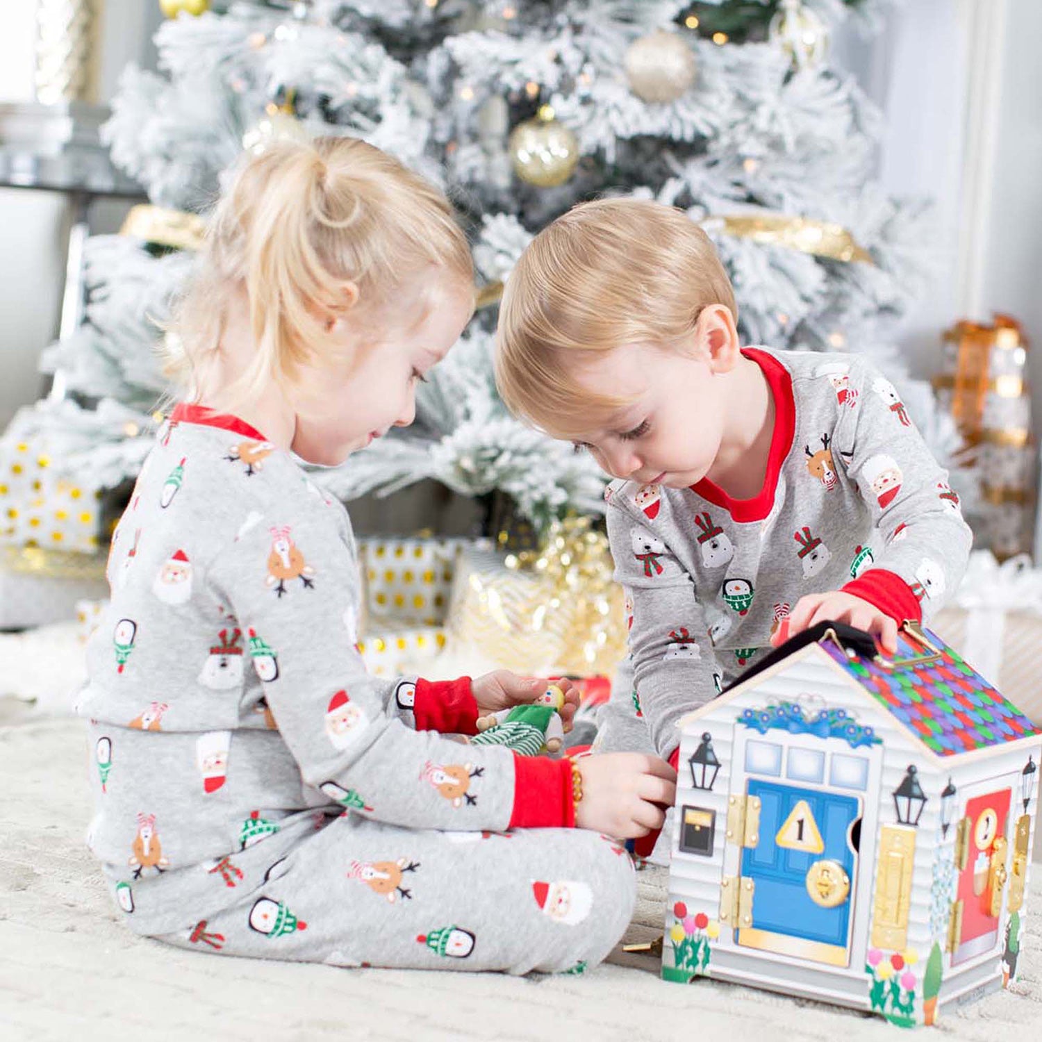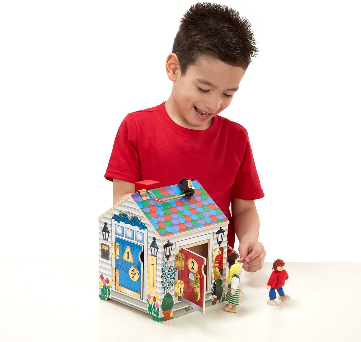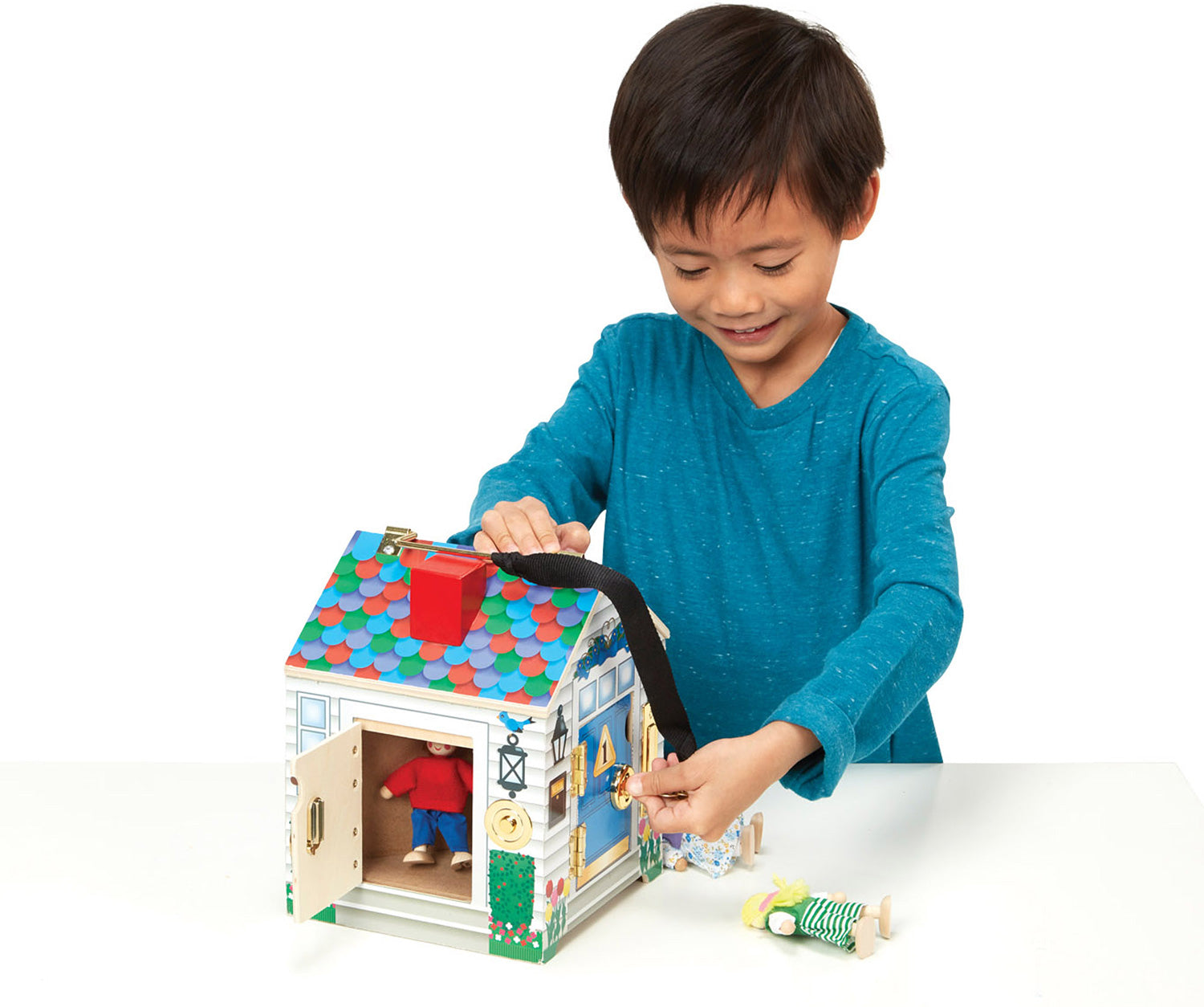 How much play fits under one roof? We count 4 doors, 4 locks and keys, 4 doorbells, and 4 family figures! Charming styling with a handle on top, and each door brings its own lovely doorbell melody. Requires 2 AAA batteries.