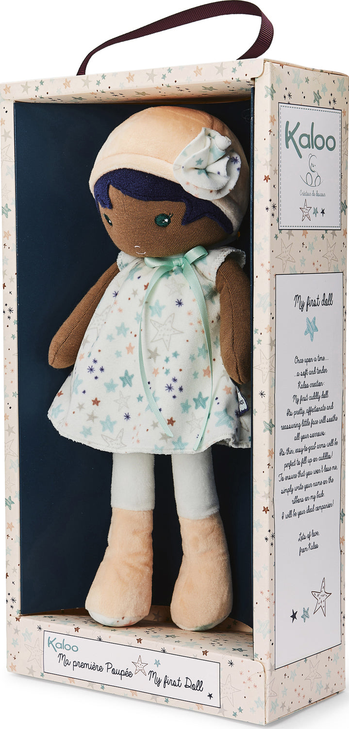 Manon K is the little bohemian girl of the Tendresses range. Her dress with pastel stars encourages dreaminess. Soft and tender, she will be your baby's companion throughout all explorations and trips. Together they will experience the happiest of adventures. Several finishes make Manon K even more charming: her peach-coloured boots that match her lovely hat adorned with a flower in harmony with her dress and an elegant bow around the neck. You may write your child's name on a long ribbon on the back to prevent the toy from getting lost. 32 cm, suitable for new-borns, machine washable, presented in a lovely case (19.5 x 8.5 x 36 cm)