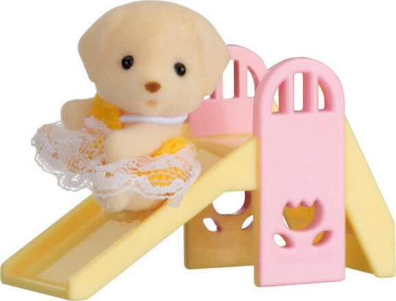 Mini Carry Case set features a clear house-shaped carrying case and includes an adorable babies inside. Leave the critter and furniture in the case and use as-is for decoration, or take them out to play with. 3 types of babies and furnitures are included. Hopscotch Rabbit with a high chair, Yellow Labrador with a slide, and Tuxedo Cat with a see-saw Babies have adjustable head, allowing for various poses. Use together with other critters and furniture for even more fun possibilities (sold separately). 3 Hopscotch Rabbit Baby (Sitting) with Baby Chair in House-Shaped Case (a total of 3 pieces), 3 Yellow Labrador Baby (Sitting) with Slide in House-Shaped Case (a total of 3 pieces), and 3 Tuxedo Cat Baby (Sitting) with See-Saw in House-Shaped Case (a total of 3 pieces)