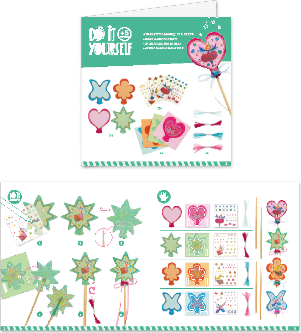 A creative kit for making 4 magic wands. Children can assemble and decorate the magic wands using the stickers, rub-down transfers and ribbons in the kit. When they are finished, the wands sparkle thanks to the glittery finish! • An original, all-in-one