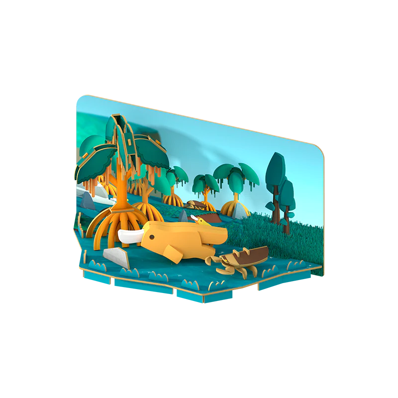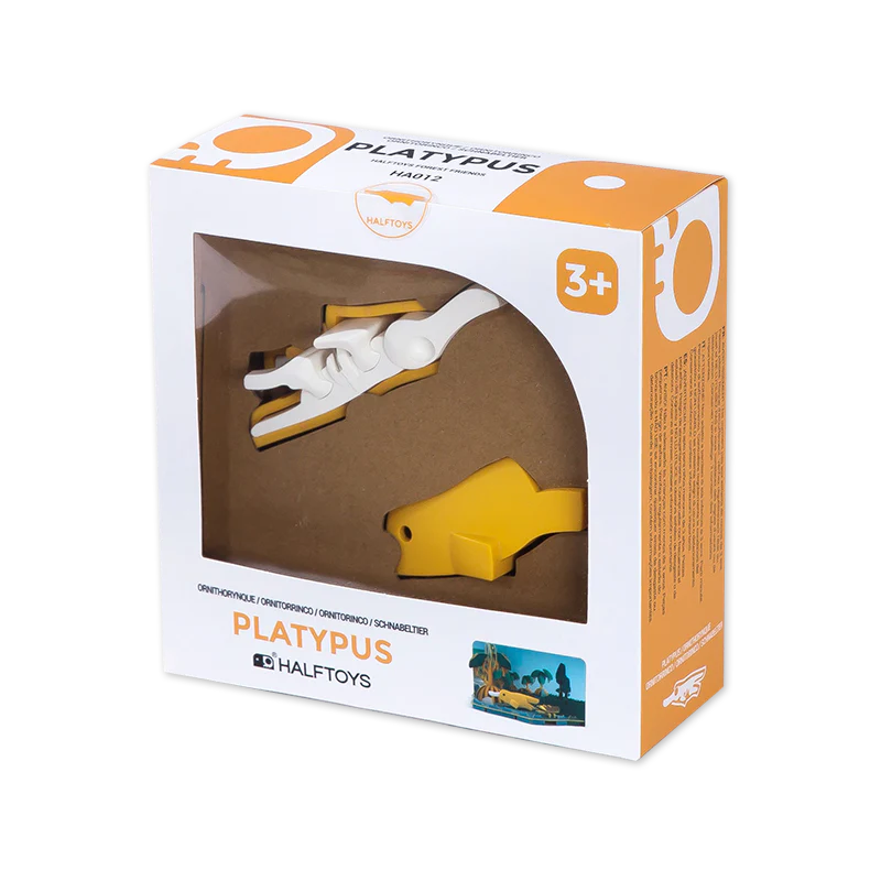 The platypus is a fascinating mammal that lay eggs. Their webbed feet make them great swimmers and their sturdy claws allow them to dig! As a HALFTOY, you can open its magnetic shell to find the skeleton, a 3-piece bone puzzle. Each animal figure comes with a diorama that can be linked to other dioramas in the HALF ANIMAL collection. Collect them all and build a scenic animal world!