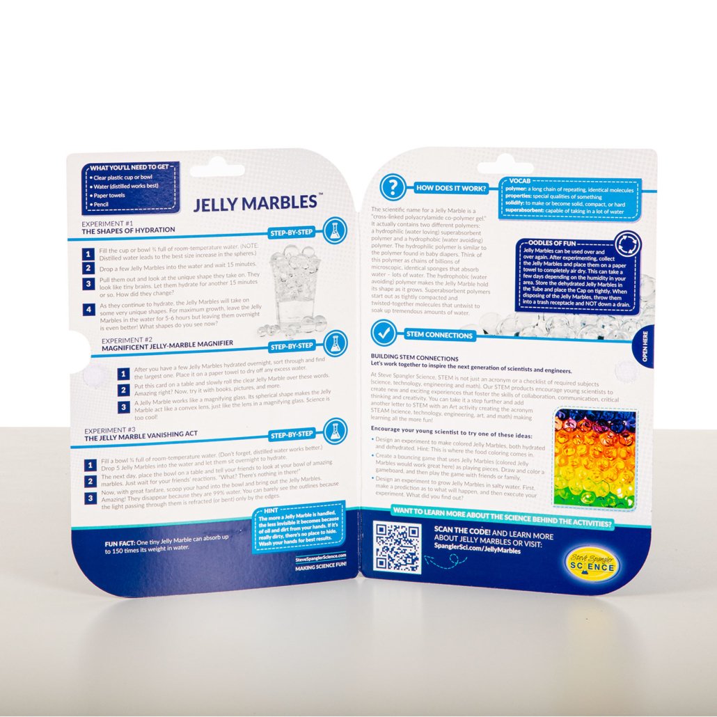 Just add water and discover the magic! Place these tiny, solid spheres in water, and in just a little while you will have your own Jelly Marbles that absorbed over 150 times their weight in water. These superabsorbent water marbles are the newest craze around the Spangler Science offices! What starts out as a 3mm pebble, quickly becomes an approximately 20mm ball of jelly! Similar to our Water Jelly Crystals, these water beads absorb a lot of water, plus they maintain their spherical shape when they are done growing. Not only are these superabsorbent marbles fun, they teach a valuable lesson about the power of polymers.