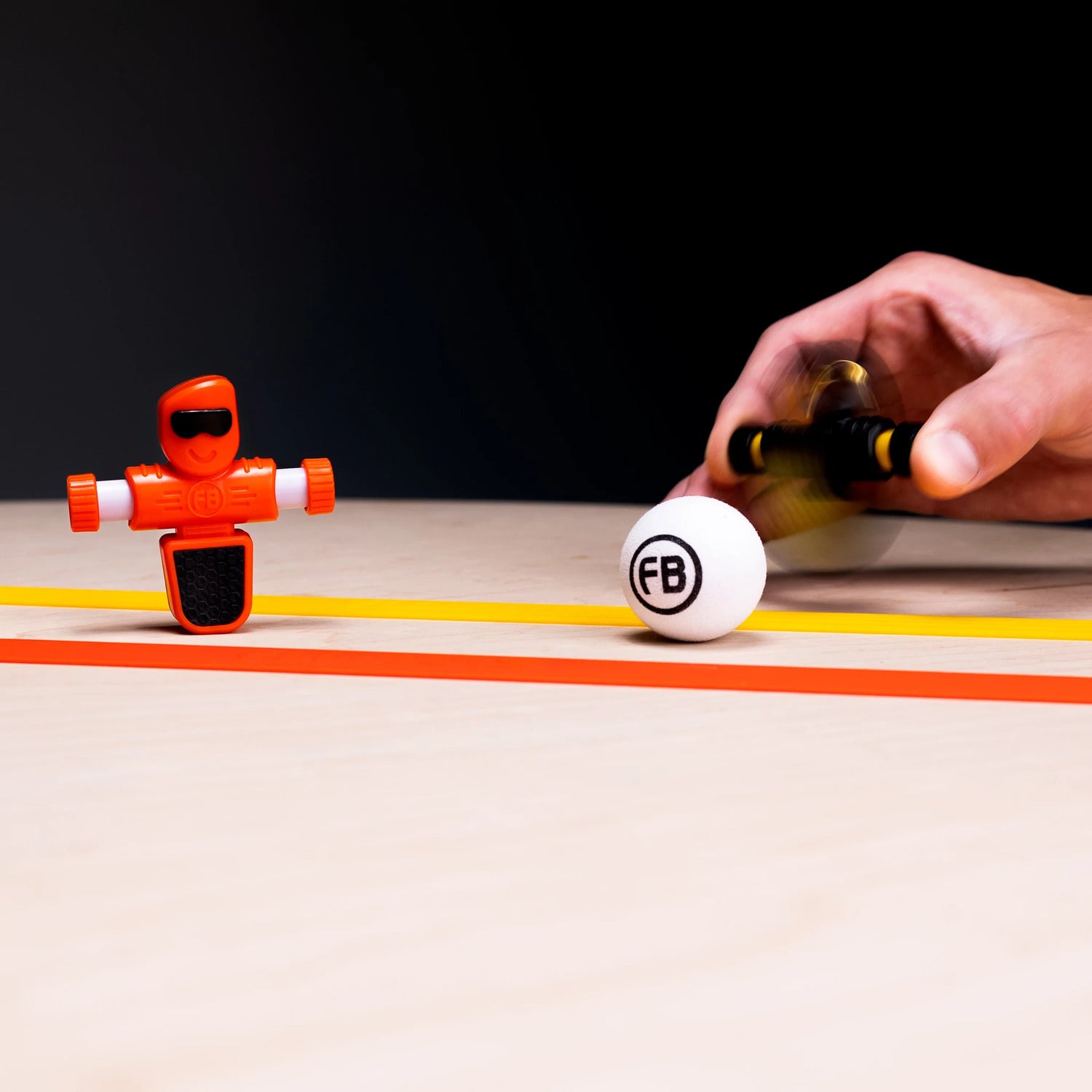 Roll out one of the silicone goal lines onto your side of the table, then grab your Foosbot. When you squeeze its arms, it spins to kick the ball FAST. Can you get the ball past your opponent's goal while letting nothing past yours? With intense, fast-paced gameplay, portable design, and more Foosbots to collect, the thrill never stops!