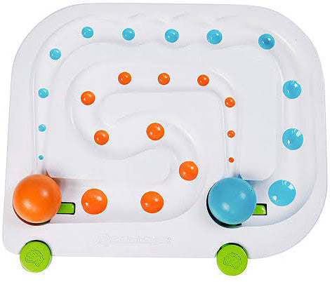 Fascinating physics inspires hours of play! Press one of the the two buttons to launch and watch as the gradually widening track propels the ball forward. Send the blue ball rolling down the long zig-zaggy track. Send the orange ball swirling along the winding curvy track. Or, launch them both at the same time to see which one's the fastest! Exploration and experimentation are on a roll the moment kids get their hands on the RollAgain Maze. RollAgain Maze Cleverly designed ball run Encourages fine motor skills, tactile learning, cause-effect learning, exploration An innovative twist on classic ball-run fun Balls are propelled forward by gradually widening tracks Press buttons to launch balls down the tracks Includes 2 balls, RollAgain Maze High quality materials and construction - Lasting durability