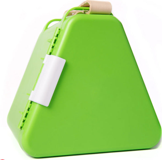 The must-have accessory for all your on-the-go adventures! Teebee is more than just a box for storing your favorite toys. So much more. Unlike clunky rectangular boxes that have to be set off to the side during play (heightening the risk of them being bumped and spilled), Teebee is designed to fit perfectly between the legs, turning it into a storage space and play space in one - Emphasis on the play. The two hinged lids fold out smoothly to create play trays that sit nicely over each leg while the divided tray can be taken out and fitted onto the front edge of the Teebee. No more having to juggle or balance toys precariously on your lap! And here's the best part - It's amazingly versatile. You can use it for arts and crafts, action figures, open-ended building toys - It comes with a brick plate for your interlocking bricks! - Plus, it's made entirely of food-safe, leak-proof plastic, so you can even use it as a lunchbox and food tray in one! Once you befriend Teebee, it'll be hard to imagine how you were ever able to live without it. Teebee - Play & Store Toy Box Unique storage box cleverly designed for frustration-free on-the-go play An absolute must-have accessory for all your travels Triangular shape fits comfortably between the legs - Less risk of it being bumped over 2 hinged lids fold out to become play trays Divided sorting tray fits onto front edge Features brick plate for building with interlocking bricks Food-safe - Makes a perfect lunchbox for eating in the car, on the plane, or anywhere Features a leather adjustable handle - Easy to carry Snaps shut securely with hinged fastener Includes one Teebee storage box, friendly eye stickers for adding a touch of personality Measures 5.75 x 6.75 x 6.75 inches when closed Measures 17 x 14 x 5.25 inches when open with sorting tray attached to the front Made of high quality, Food-Safe, BPA-free plastic Hand wash