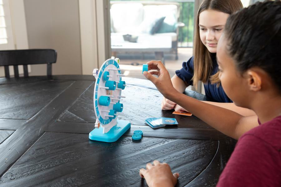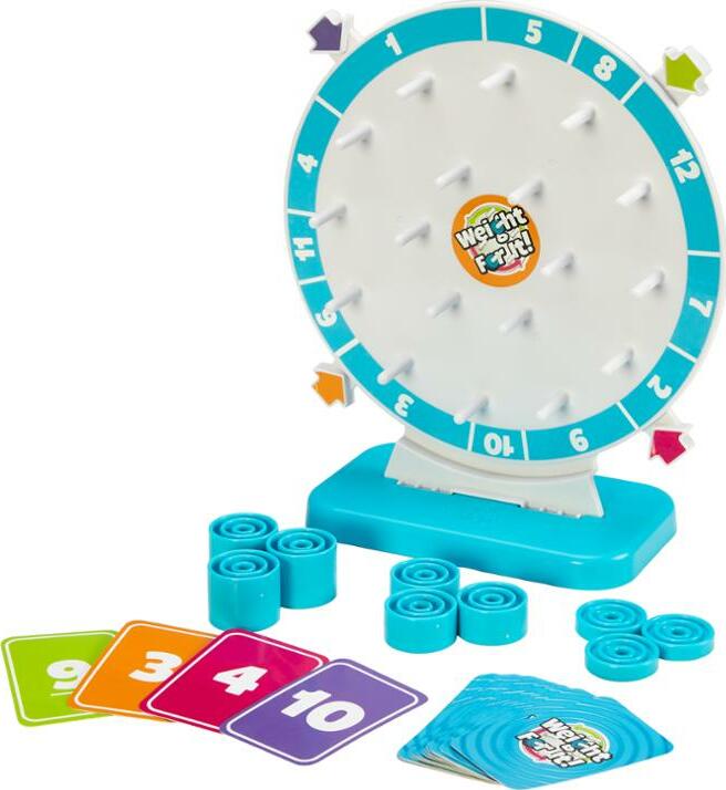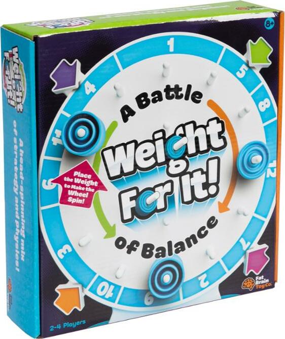 It's a head-spinning mix of strategy and physics! Players take turns placing the weights onto the wheel to try and turn it so the correct arrow is aligned with the number on their card. Line it up just right to keep the card as a point. Get it wrong and you have to wait to try again on your next turn. Can you handle the suspense as the wheel swings back and forth past your number? The first to earn three cards wins the game! 2 to 4 players. Ages 8+