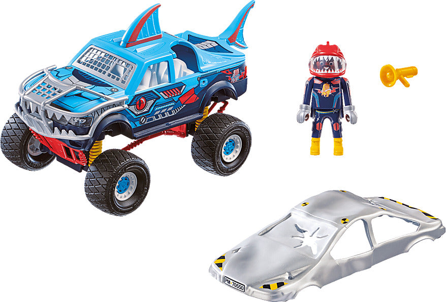 The Stunt Show Shark Monster Truck is pure adrenalin for action fans! The ingenious design with a sleek fin on the roof, dangerous shark-bite radiator grille and grille windshield make the Shark Monster Truck unmistakable. With its fully suspended axles and wheels that adapt to any surface, the Monster Truck can handle the most difficult stunts and obstacles. The daredevil stuntman spares no risk and drives with momentum over a scrap car. This heavyweight is unstoppable! The set consists of a PLAYMOBIL figure, a shark-design monster truck with fin to put on, a drivable scrap car, helmet, gloves, megaphone and other cool extras.