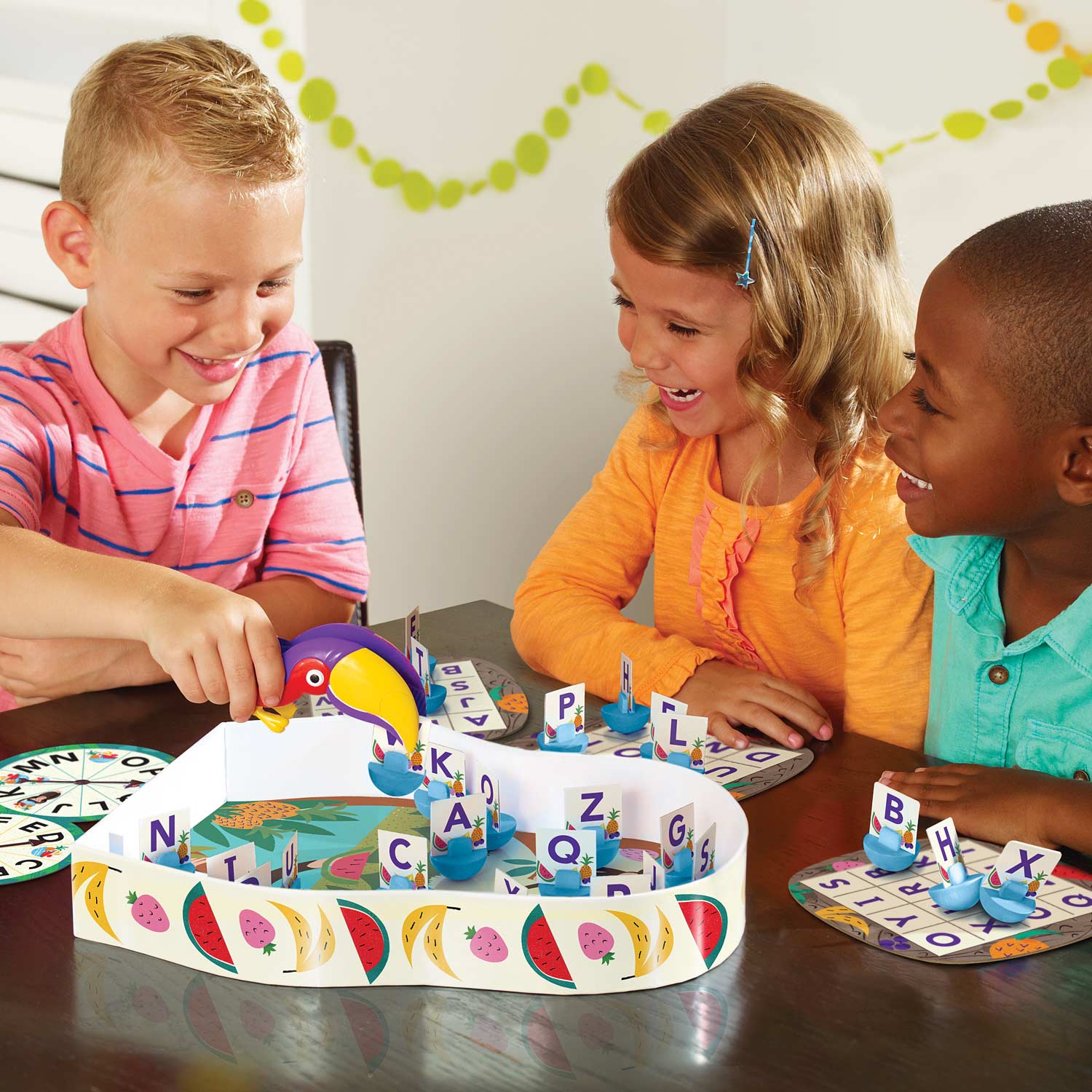 Learn letters with Frida! It's lunchtime in the rainforest and Frida is collecting letters for her little ones. Spin, find, squeeze, and be he first to set four letters in a row using your Frida squeezer to win this fruity preschool letter game. For 2-4 players.