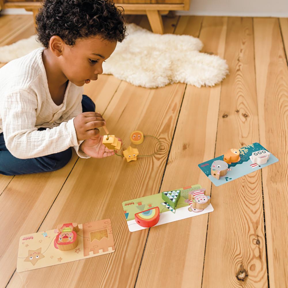 - The child can decide either to follow the instructions on the cards or to string the individual building blocks together with their own creative imagination.