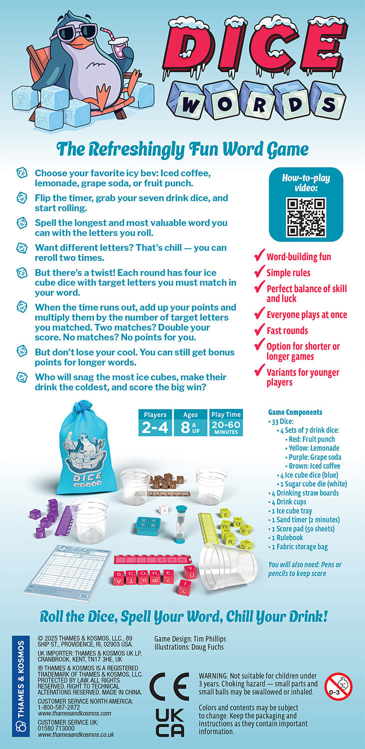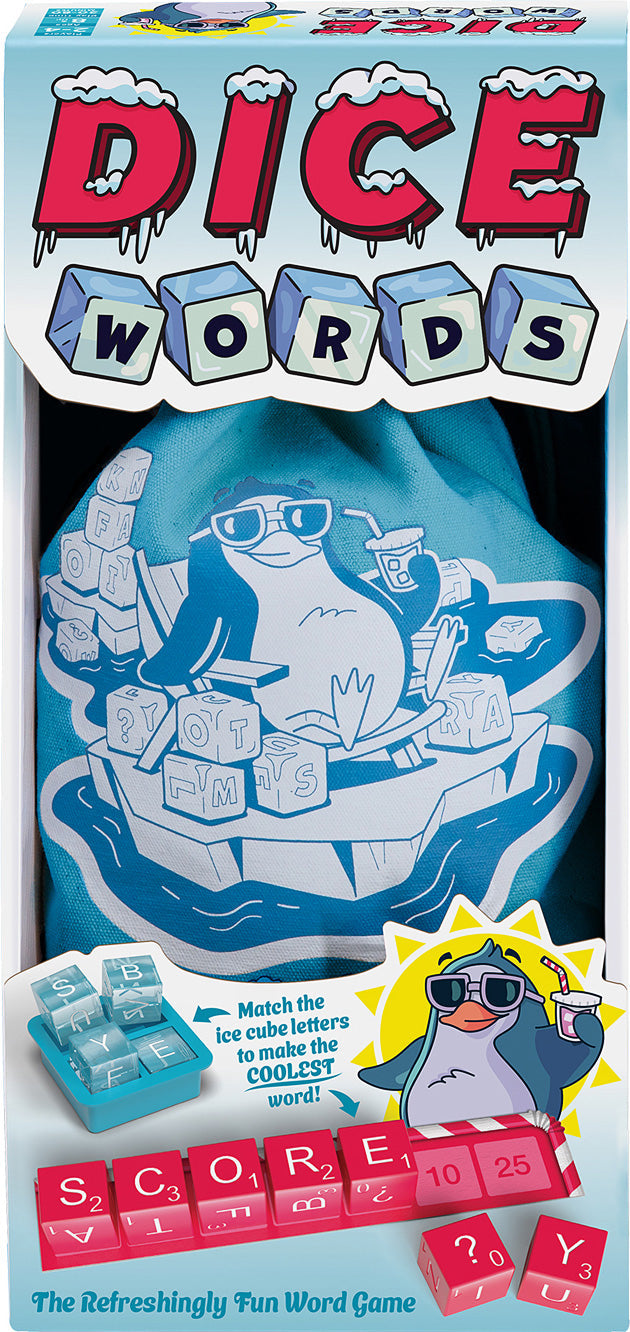 Discover a cool new word game that combines skill, luck, and speed into a clever, family-friendly game that's sure to be an instant classic! Each player chooses a set of 7 letter dice that each represent a different iced beverage. When the timer starts counting down, players attempt to form the longest and most valuable word possible. Re-roll any of your dice up to two times before the round ends to try to get the letters you need. In addition to your dice, you must also try to incorporate the most "target letters" - 4 ice cube-shaped letter dice that are revealed at the beginning of each round. The colder your drink, the higher your score! Fast-paced rounds and simultaneous game play minimizes downtime and keeps everyone on the edge of their seats. For 2-4 players.