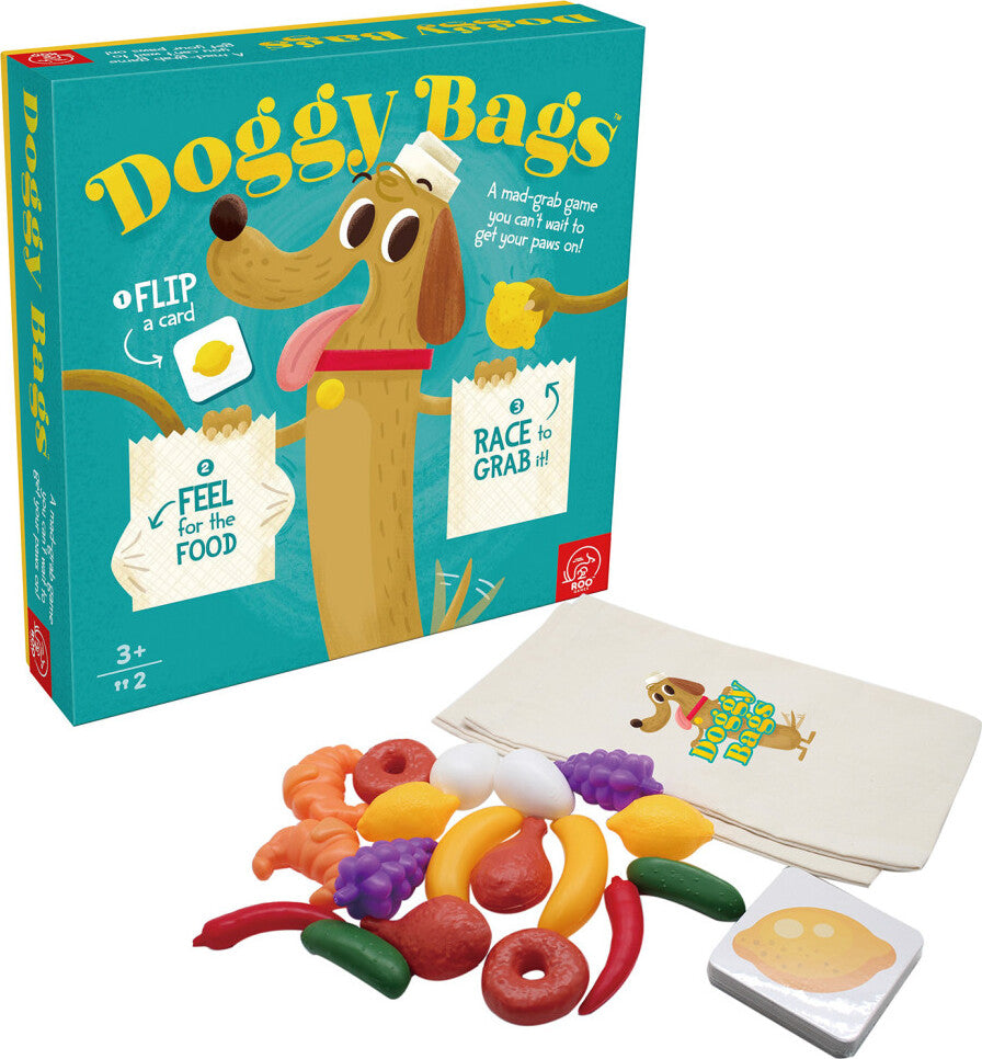 HOW TO PLAY -- Split the foods evenly into 2 bags. Draw food cards and race to find the items in your bag. Move quick and no peeking! The first player to feed Franky 5 foods wins