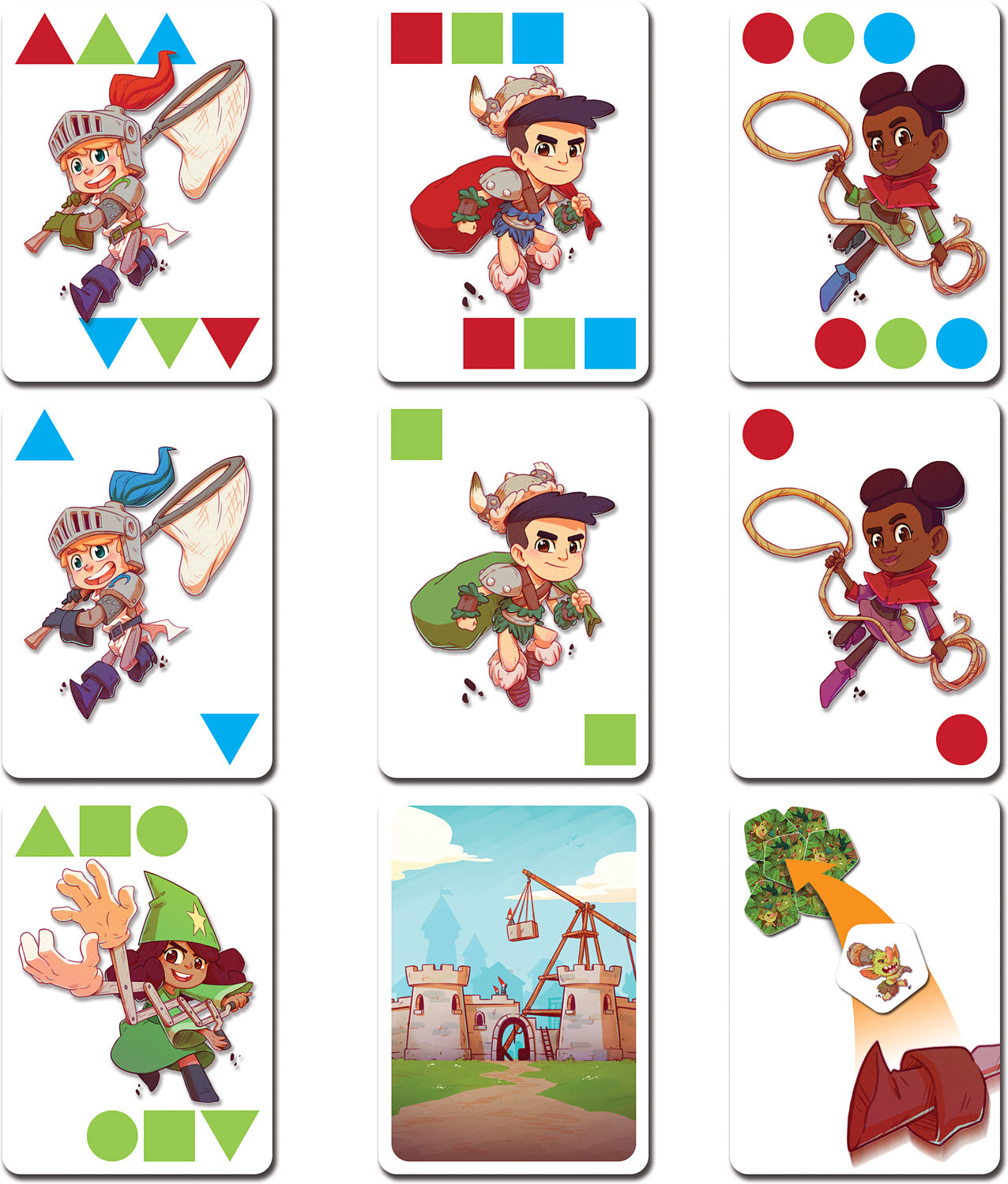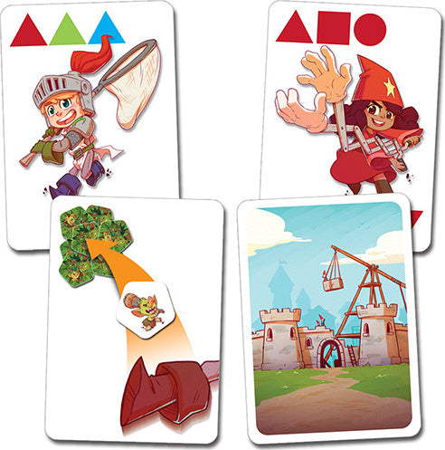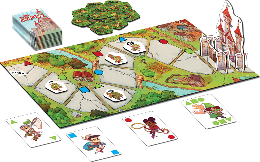 In My First Castle Panic, a group of monsters is racing out of the woods and coming right at your Castle! Players need to catch all the monsters before they smash the Castle flat. Send out your brave defenders to match the color and shape of the space where a monster is to catch it. But watch out! The monsters move closer to the Castle every turn, and more monsters keep coming!