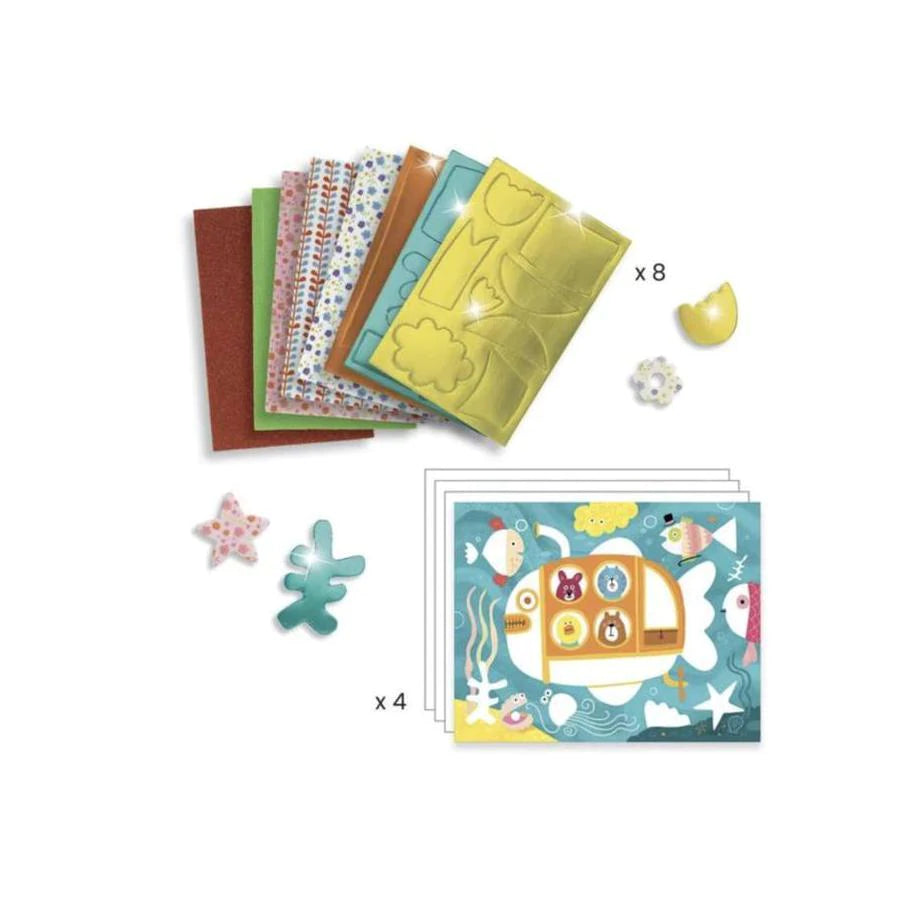 The creative activity Foam Fun by Djeco is a collage activity to make 4 paintings with self-adhesive foams printed, glittered and metalized. An introduction to mosaic for children who must glue pretty foam shapes on really inspiring illustrations.