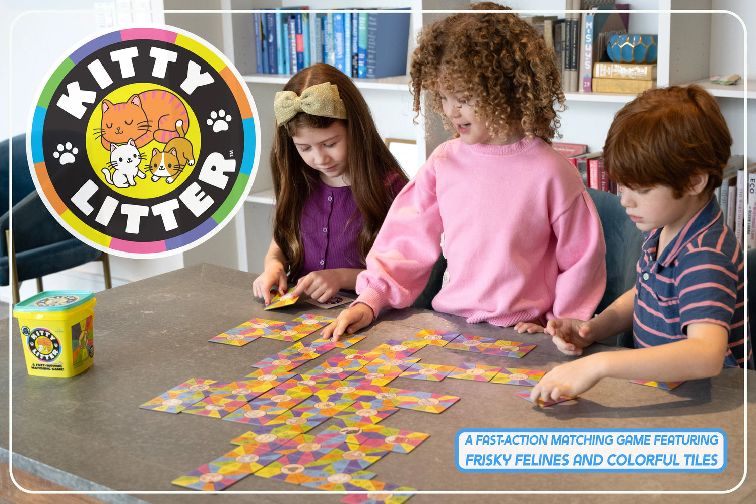 This kitty litter pail-inspired matching game features mischievous kawaii kitties. Players race to match all their colorful tiles first in simultaneous, easy-to-learn play. Quick rounds and endless fun make this game a purr-fect addition to any family collection!